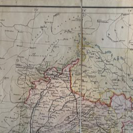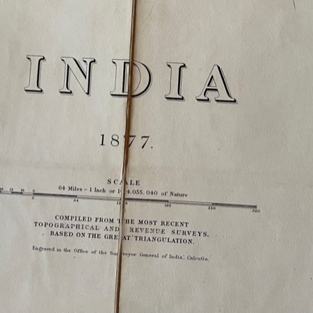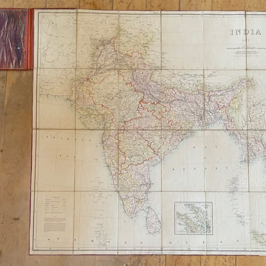 Survey of India Thuillier, Col. H. L., Surveyor General of India: INDIA 1877 Compiled from the Most Recent Topographical and Revenue Surveys Based on the Great Triangulation. Folding Map. A large folding engraved map of the whole of India on a scale of 64 miles to 1 inch noted as being Preliminary Edition (without hills), 42 x 40 ins when unfolded, coloured, dissected and mounted on linen, folding into contemporary official orange red cloth covered boards 10¼ x 7¼ ins, titled INDIA on the spine and on the front board TOPOGRAPHICAL DEPARTMENT INDIA in an oval around the royal coat of arms, boards marked and worn with fraying to cloth at head and tail of spine and splitting along the external cloth of the joints, the map is clean. The map is coloured and shows full detail as far as Kabul and Kashmeer in the north and has some uncoloured detail beyond that as far as Yarkand. It also shows detail in Nepal and Tibet as far as Lhassa but is blank further north into Tibet. British Burma is coloured and in full detail and some detail is given of other parts of Burma and also of the western part of Siam. Ceylon and the Andaman Islands are detailed and a small coloured inset map off the south coast shows the Malay Peninsula and Sumatra. British Territory is shown in pink, Dependent and Subordinate Native States in yellow and Independent States in green. railways are shown as in use or under construction.