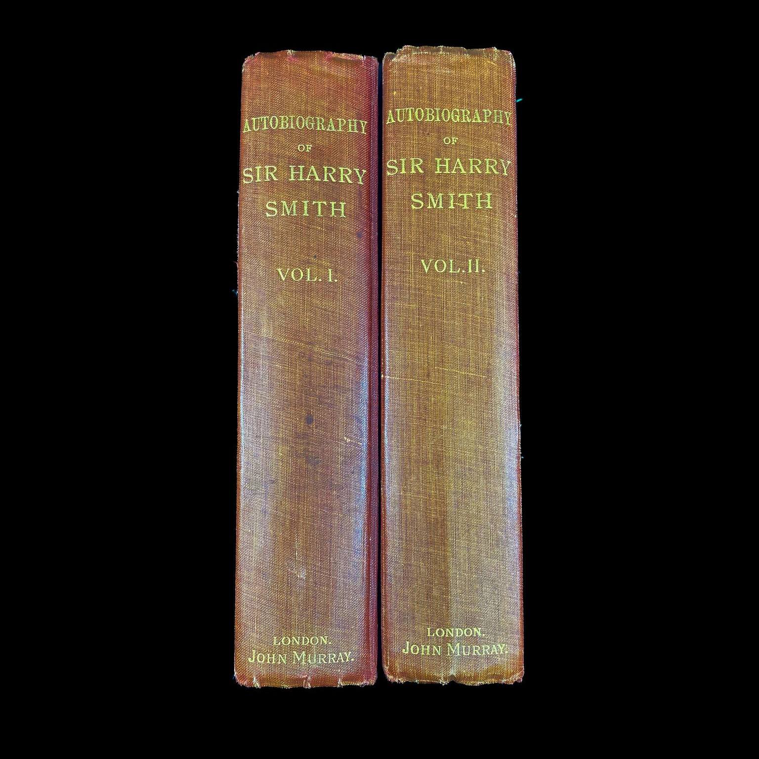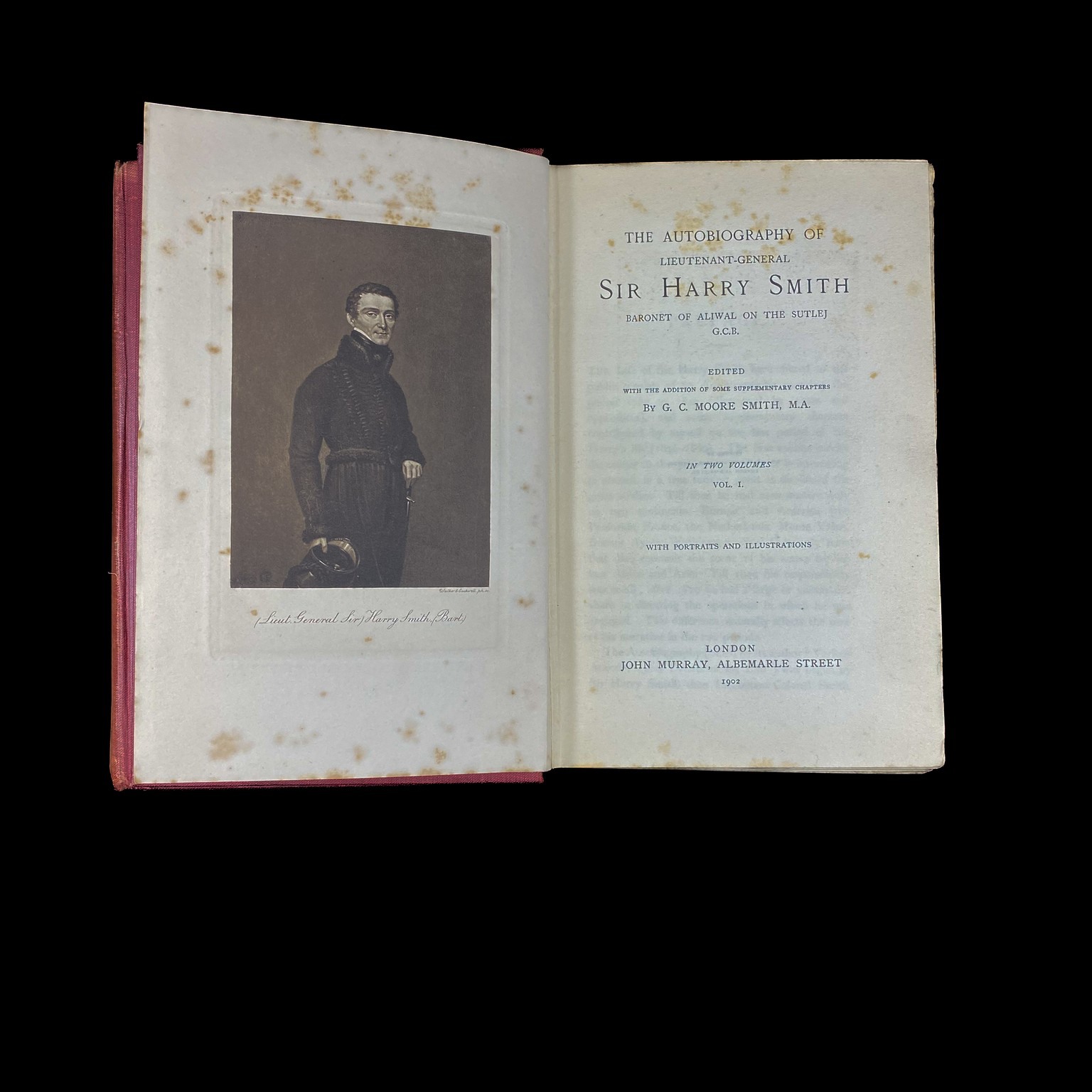 A good copy of his autobiography. The Autobiography of Lieutenant General Sir Harry Smith, Baronet of Aliwal on, the Sutlej, G.C.B. Edited with the addition of supplementary chapters By G C Moore Smith John Murray 1902 2nd 1902 printing of the 19011st edition 8vo, in two volumes. Smith’s career was so long and varied that it is hard to exaggerate the reach. From serving in South America, the Penninsula, fighting with his brothers at Waterloo, to India at Maharajpore and most famously at Aliwal in the Sutlej, the Kafir War in Africa, Governor of the Cape, etc. Smith died without issue after romantically marrying the wife he rescued in the Peninsula.