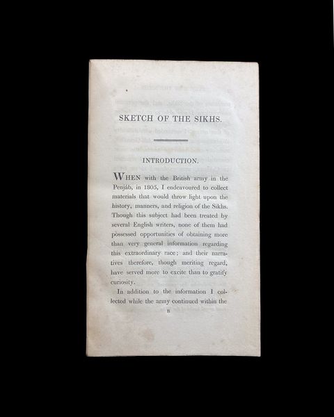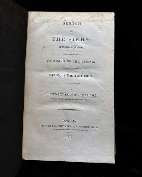 Malcolm's seminal work, 'Sketch of the Sikhs', published in its first edition in 1812, presents an insightful exploration of the distinctive Sikh community residing in the Penjab provinces, nestled between the rivers Jumna and Indus. This groundbreaking publication, released in London by John Murray, delves into the unique cultural and social aspects of the Sikhs, a community that stands out for its singular traditions and practices. The title page of this edition bears a notable inscription in brown ink, 'Eclectic Review,' adding to its historical significance. Additionally, the book features an indistinguishable library stamp, further emphasizing its journey through time and its importance in the study of Sikh history and culture.