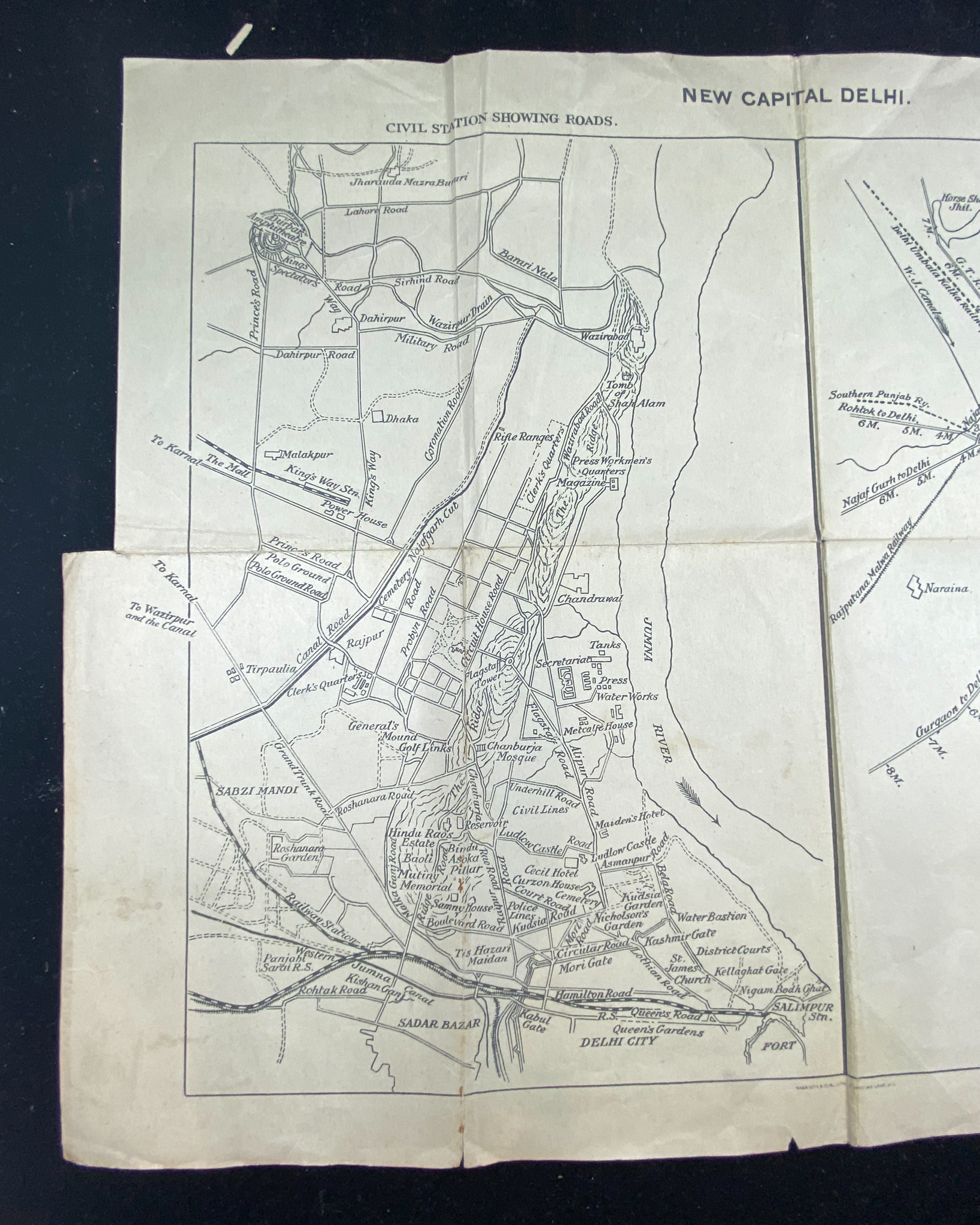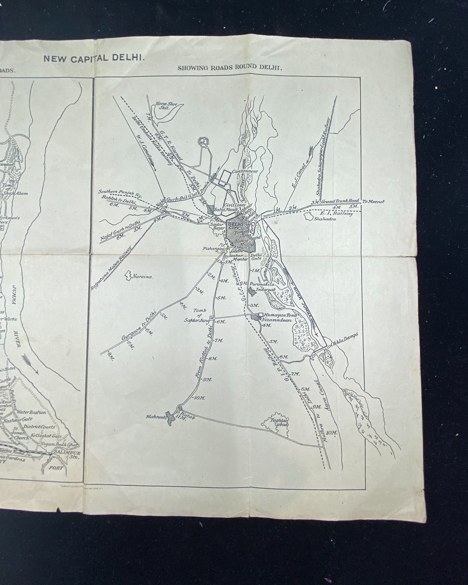 Folding map titled NEW CAPITAL DELHI with two maps on a 17 x 12 ins sheet which folds down to 4½ x 5½ ins and has clearly been in a guide book of some sort but we are unsure which. One map shows the street plan with the Durbar Amphitheatre and Kingsway station top left and entitled Civil station showing roads, the other titled Showing roads around Delhi . The map appears to date from December 12, that the then-King-Emperor caught the whole nation off guard when he announced the move of India’s capital from Calcutta to Delhi., and the completion of the Lutyens buildings of the new capital.