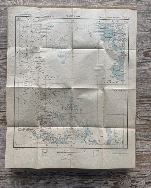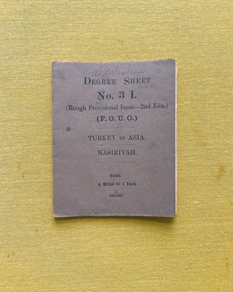 NASIRIYAH. Turkey in Asia (Rough Provisional Issue-2nd Edn.) Degree sheet No 3 I. (F.O.U.O.). Scale 4 Miles to 1 inch. Survey of India [Calcutta] 1916. Check out this rare folding map of Nasiriyah, Turkey in Asia from World War I! This artifact provides valuable insight into the geography and military operations of the Nasiriyah region during WWI. Published in 1916 by the Survey of India for official use only, the map covers part of the Province of Basrah and has a scale of 4 miles to 1 inch. It folds down into 16 plates and has original printed card endpapers, making it a portable and essential tool for military operations in the field. The map's pristine condition and the indistinct pencil signature of an A.S.C. officer underscore its historical significance. It is especially interesting to note that Sikh soldiers fought in the Gallipoli campaign in Turkey during World War I, raising the possibility that they may have used this map during their operations in the region. The Battle of Nasiriyah was a part of the Mesopotamian Campaign, which aimed to secure the oil fields of the Ottoman Empire and protect the British interests in the Persian Gulf region.