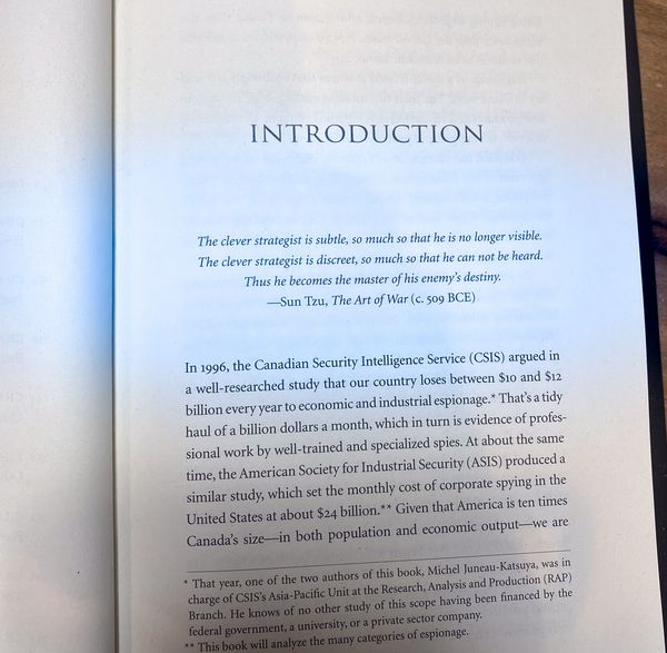 "The book begins by citing a thorough 1996 study carried out by the Canadian Security Intelligence Service (CSIS). This study unveils that Canada suffers an annual loss of between $10 to $12 billion due to economic and industrial espionage, which roughly translates to a monthly loss of one billion dollars. In contrast, a study by the American Society for Industrial Security (ASIS) claims that the United States endures a monthly loss of $24 billion from corporate espionage.