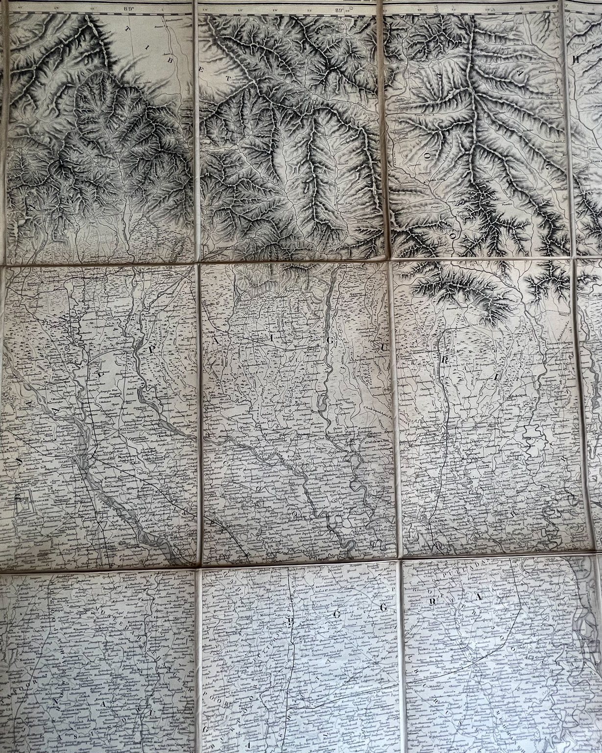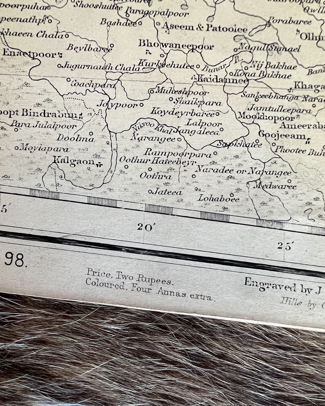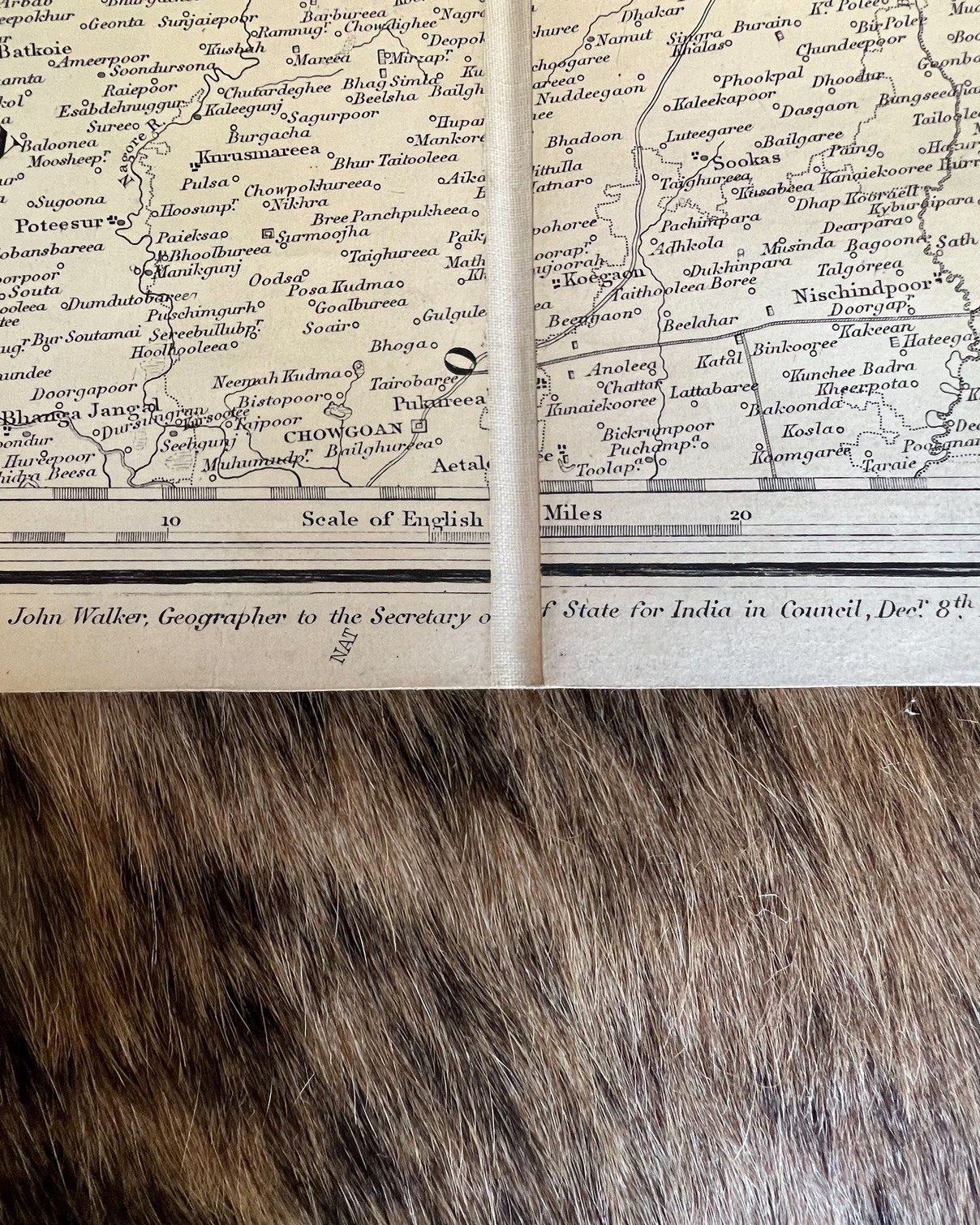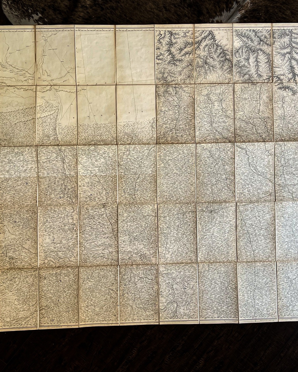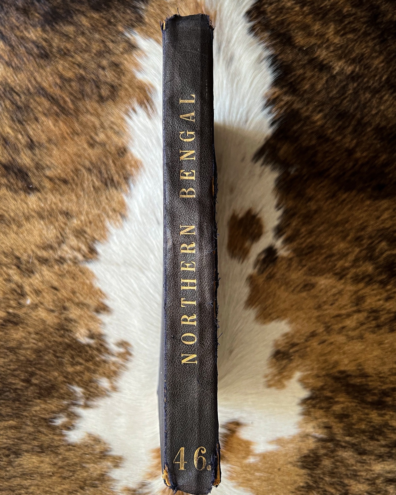 A very large folding map of areas adjoining Nepal and Tibet. NORTHERN BENGAL. Parts of Districts GOALPARA & GARO HILLS (Assam), DINAJPUR, PURNEA, RANGPUR, DARJEELING & SIKKIM & BHUTAN STATES, & District JALPAIGURI, and COOCH BEHAR. The map is made up from several sheets of the Atlas of India surveyed under the supervision of Col H. L. Thuillier, Deputy Surveyor General of India [Calcutta] the sheets variously dated between 1857 & 1866. No scale given but most probably half an inch to a mile. The sheets from top left are numbered clockwise Continuation Sheets 110, 117, 118, 124, 125, 120, 113, 103, 102. The linen-backed map folds down from its unfolded size of 80 x 51 inches to a size of 10½ x 7 ins with marbled paper covered endpapers in a black cloth covered binding labelled in gilt and numbered on the spine NORTHERN BENGAL 46. . The top left plates which are largely blank are part of Nepal and the mountainous area top right is part of Tibet. Just below the mountains is the military station of Jalpaiguri on the river Tista and the larger river joining the map top right and running south is the Brahmaputra. Near the left edge of the map 100 miles from Jalpaiguri is the princely state of Darbhanga.