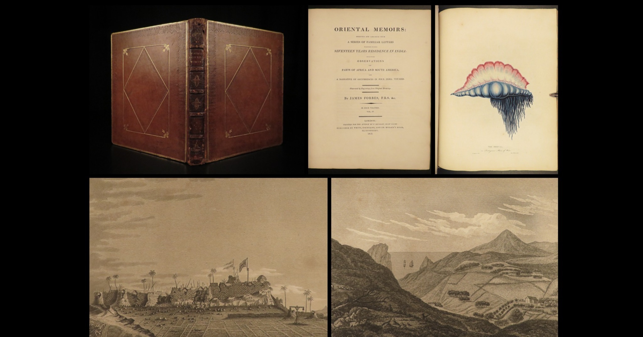 Selected and abridged from a series of familiar letters written during seventeen years residence in India FORBES, James Published by for the author by T. Bensley, Bolt Court, White, Cochrane, and Co, 1813 1813 INDIA 1ed Forbes Oriental Memoirs Raj Famous Medusa Man o War Jellyfish James Forbes was an 18th-century British author who, after traveling to India, published a series of letters and illustrations on Indian life, customs, wildlife, and history. This book, Oriental Memoirs contains numerous engravings depicting his discoveries and encounters in India. This work is still one of the best first-hand accounts of pre-British Raj India. Worth noting, the engraving of the jellyfish The Medusa, also known as the Portuguese Man o War, is known to be quite desirable and sought-after. The Portuguese man o' war (Physalia physalis), also known as the man-of-war, is a marine hydrozoan found in the Atlantic Ocean and the Indian Ocean. It is considered to be the same species as the Pacific man o' war or blue bottle, which is found mainly in the Pacific Ocean. The Portuguese man o' war is the only species in the genus Physalia, which in turn is the only genus in the family Physaliidae. The Portuguese man o' war is a conspicuous member of the neuston, the community of organisms that live at the ocean surface. It has numerous venomous microscopic nematocysts which deliver a painful sting powerful enough to kill fish, and has been known to occasionally kill humans. Although it superficially resembles a jellyfish, the Portuguese man o' war is in fact a siphonophore. Like all siphonophores, it is a colonial organism, made up of many smaller units called zooids. All zooids in a colony are genetically identical, but fulfill specialized functions such as feeding and reproduction, and together allow the colony to operate as a single individual. (Source Wiki.)