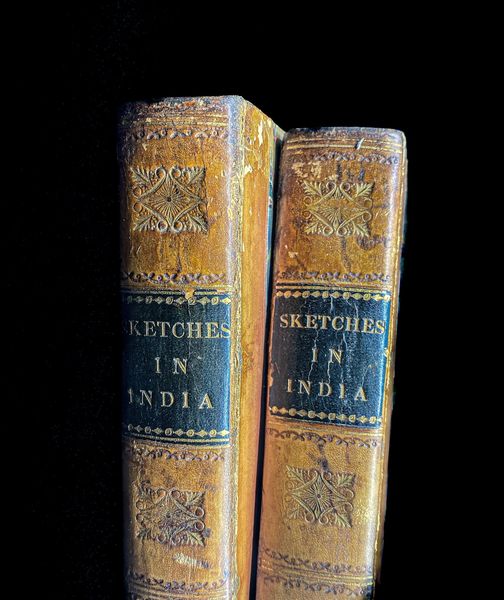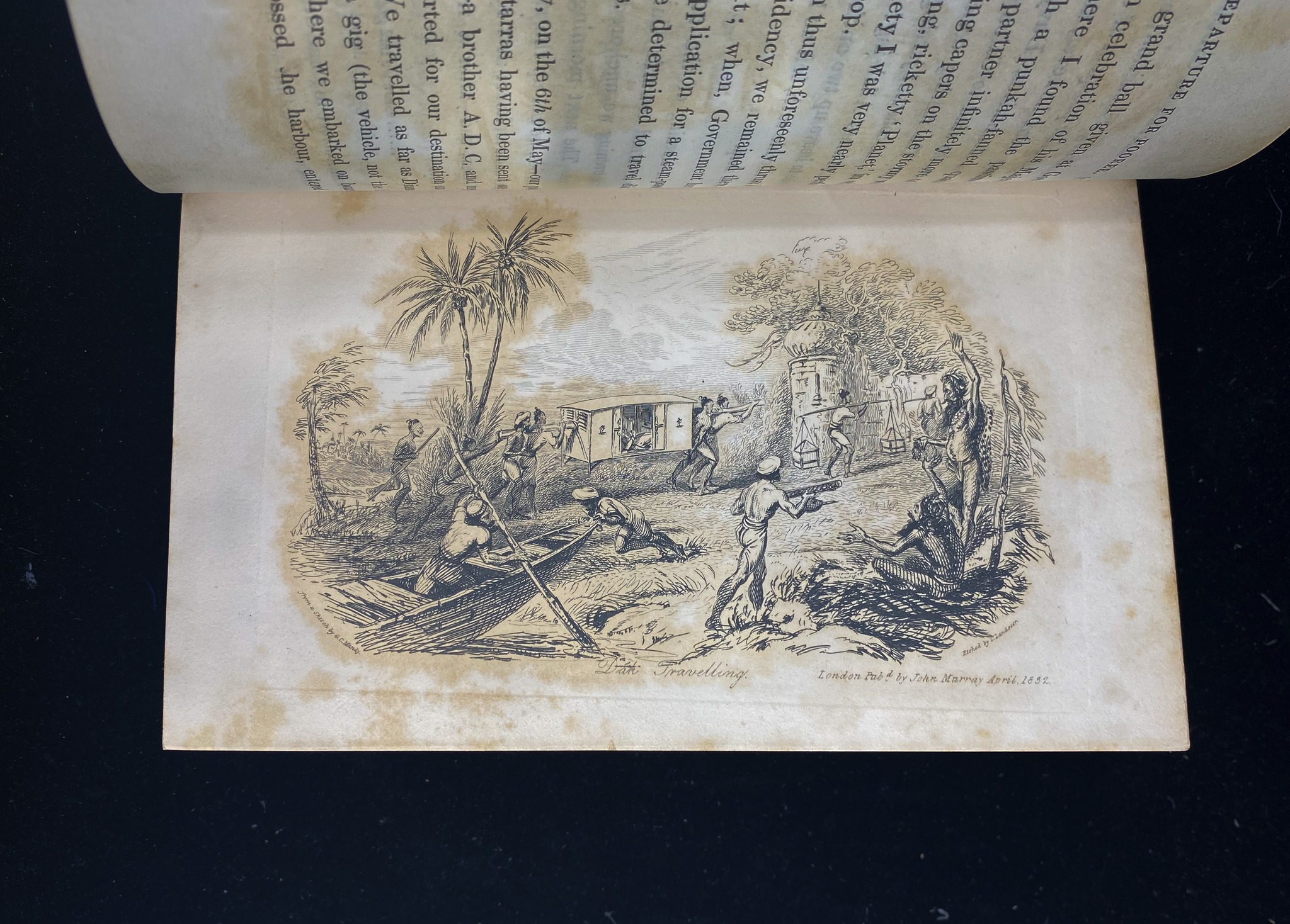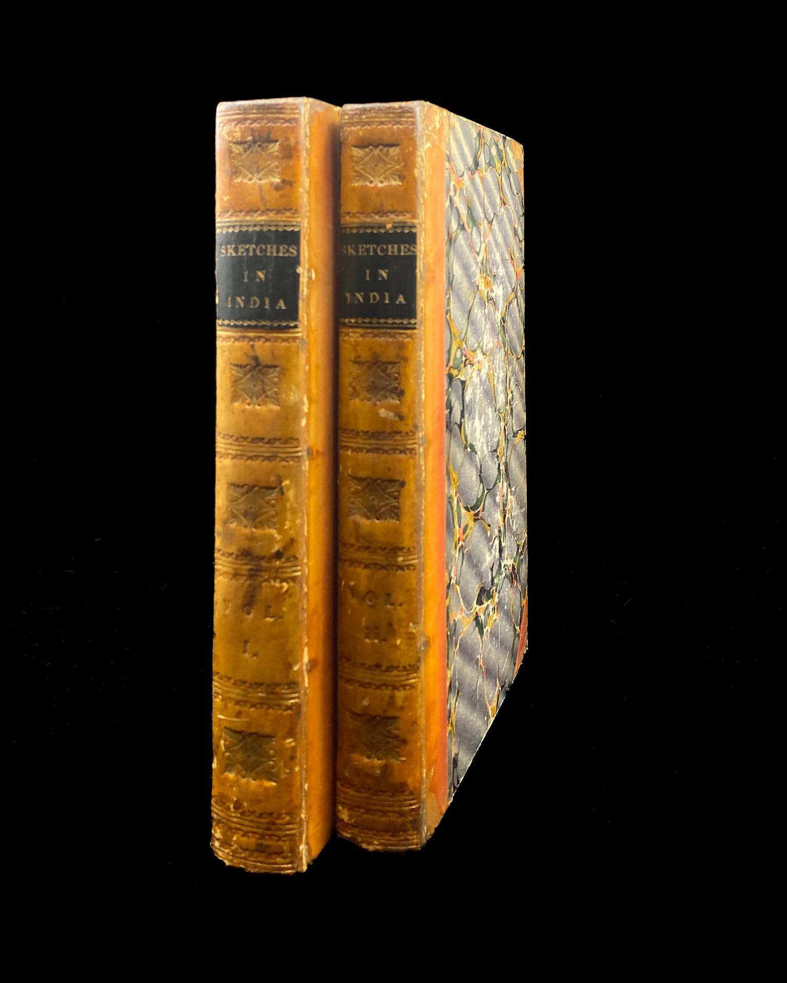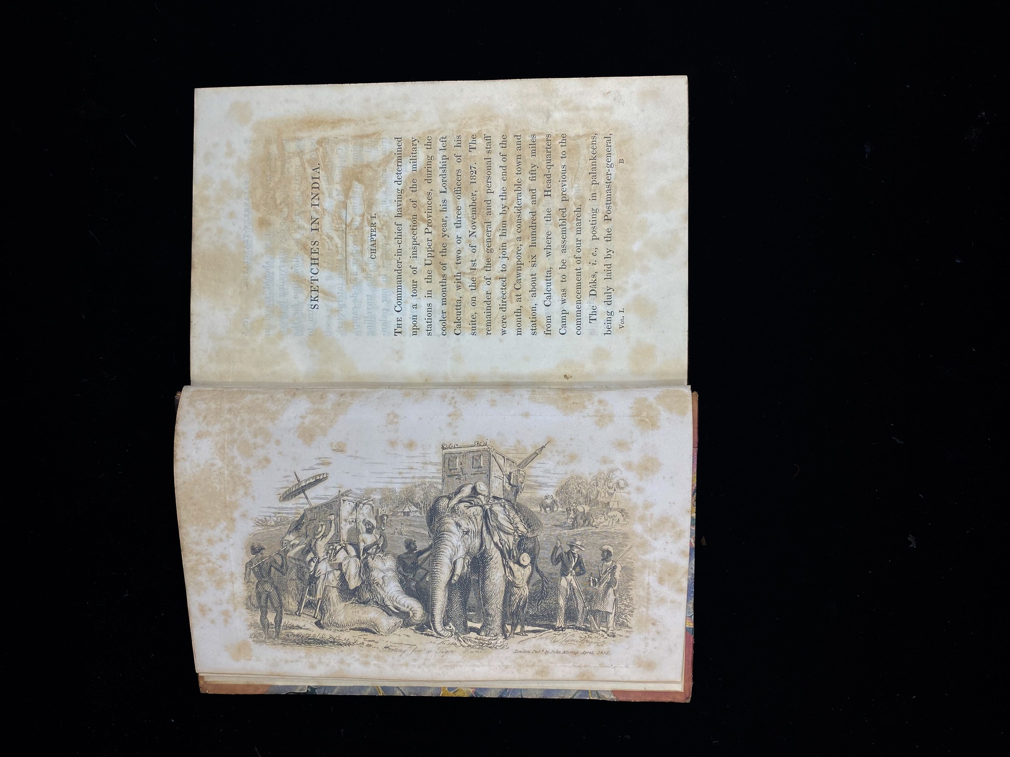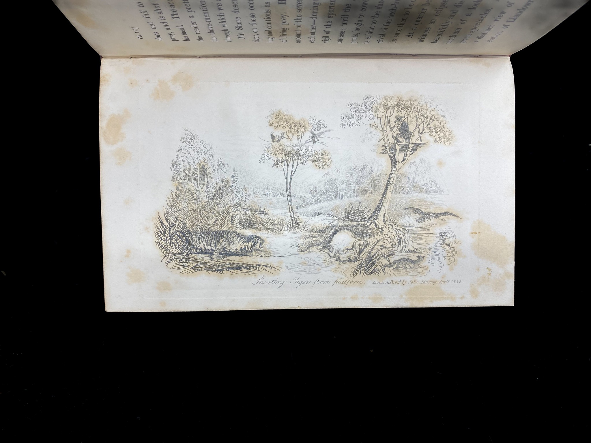 Being the Journal of a Tour in India. Two volumes. London, J. Murray, 1832. MUNDY, GODFREY CHARLES: First edition of this personal account of a hunting trip by Mundy (1804-60), a British Major General who took part in the Siege of Bharatpur in 1825. He travelled through Benares, Lucknow, the Taj-Mahal, Simla and Delhi. The charming plates are made after drawings by the author himself, of which many depict elephant and tiger scenes. "Traveling throughout India, the author hunted tiger near the Ganges and in the Dehra Dun. He spent time among the Mahrattas, observed wild elephants, and participated in antelope hunting with cheetahs and falcons. He also hunted lion between Pewur and Hansi, and thgouh none were obtained, Mundy includes a discussion of the lion hunting exploits of Col. James Skinner and William Fraser. The plates of tiger hunting from elephant back are quite striking"