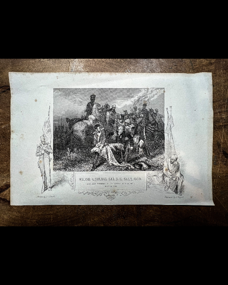 On the south bank of the Sutlej River in the Punjab in North West India. Combatants at the Battle of Moodkee: Sikhs of the Khalsa, the army of the Punjab against British troops and Indian troops of the Bengal Presidency . 'Major General Sir. R. H. Sale, G.C.B. Mortally Wounded at the Battle of Moodkee, December 18 1845.', (mid 19th century). Major General Robert Henry Sale (1784-1845) was a British soldier who from 1798 served mainly in India and Afghanistan and rose to the rank of Major-General in the army of the British East India Company. In the First Sikh War he was mortally wounded at the Battle of Moodkee (Mudkhi, in the Punjab, India), and died of his wounds on 21 December.
