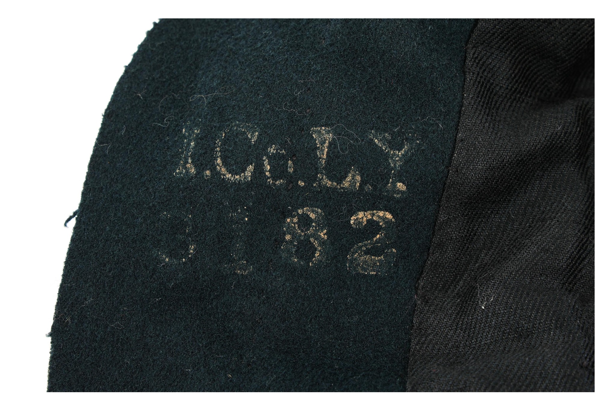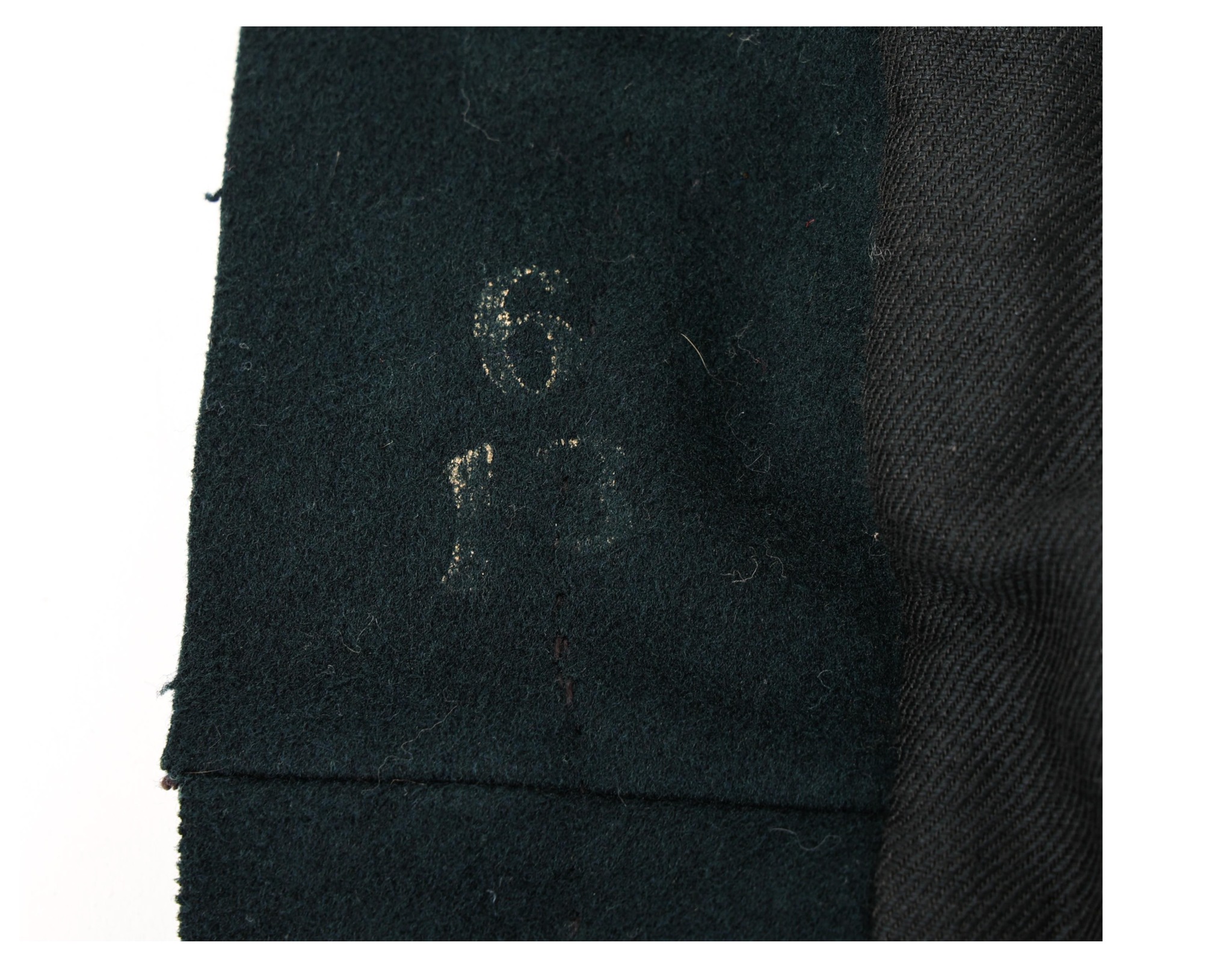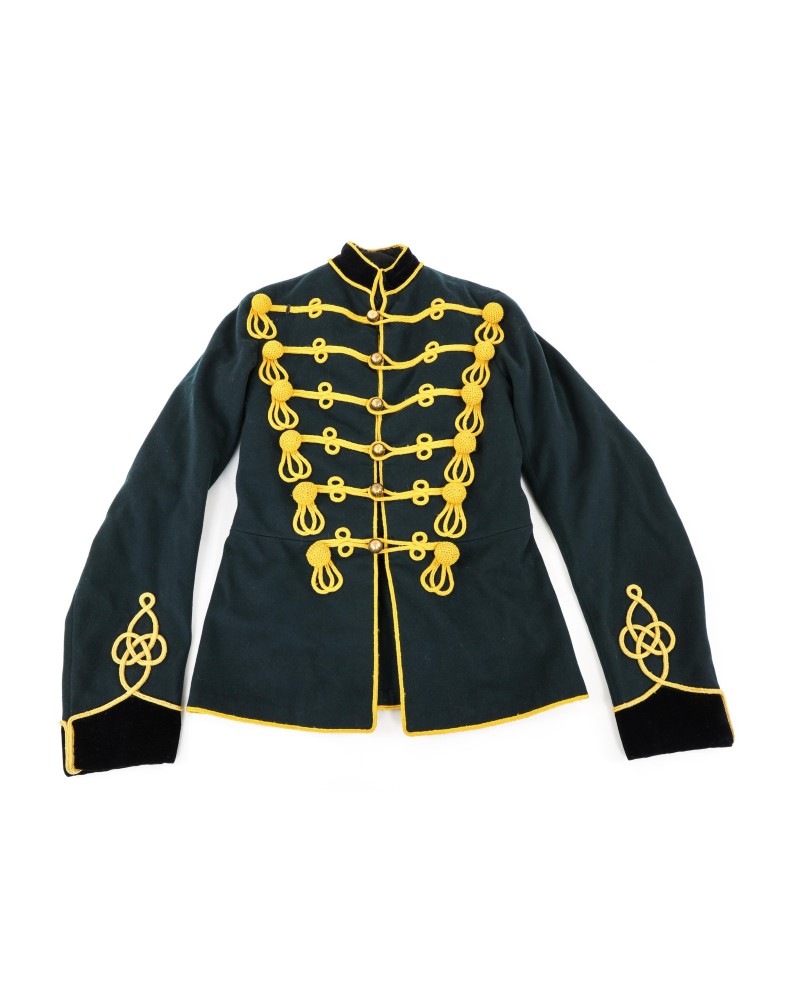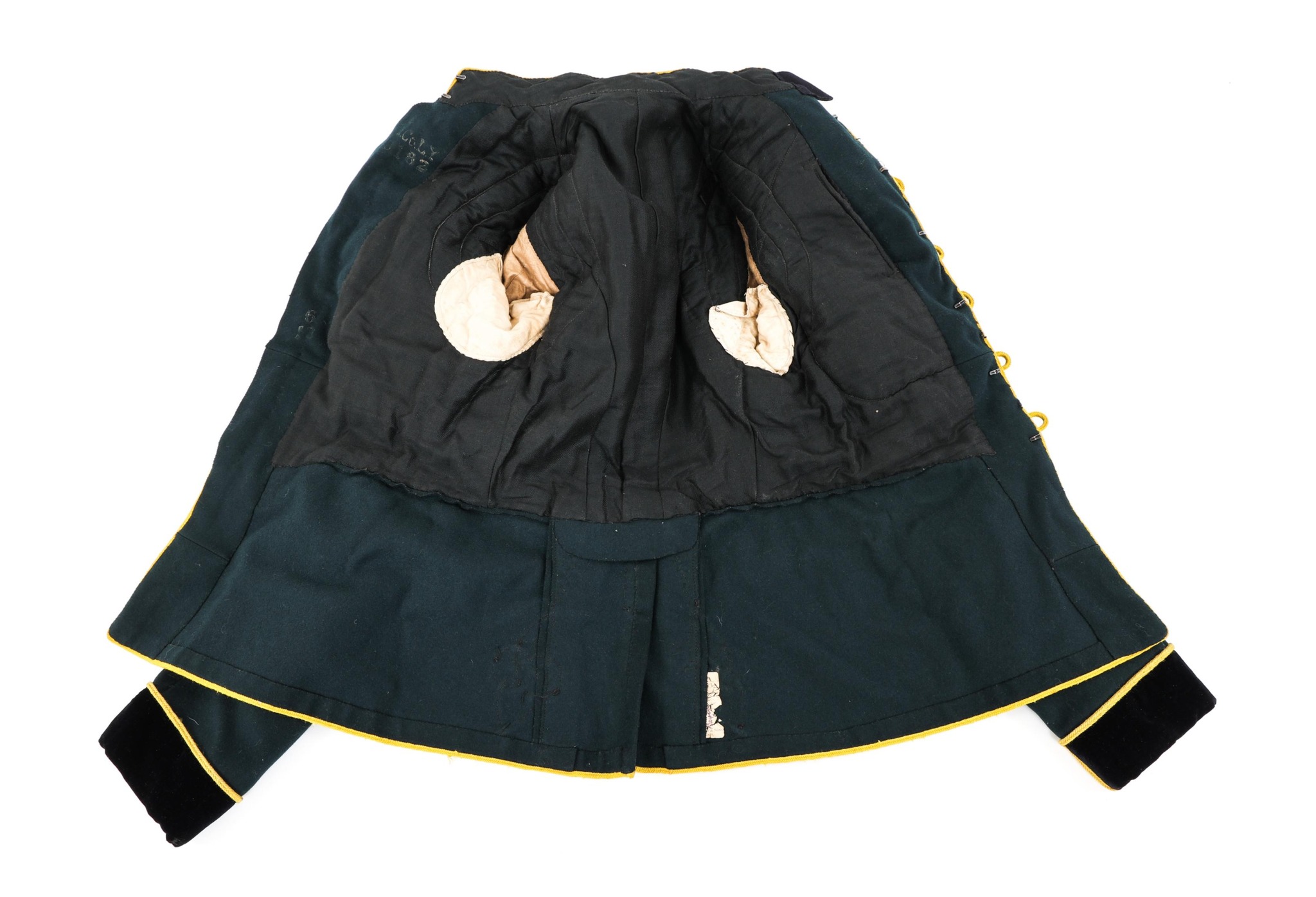 Pre WWI British Hussar Enlisted Man Dress tunic. Fine quality black wool fabric with black velvet collar and cuffs. Yellow mohair drop end loops with large yellow buttons. Tailor tag and stamping present inside.