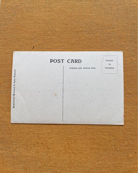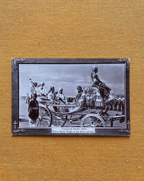 A good photographic postcard titled Coronation Durbar, Delhi. Prince Ranjit Singhi in his silver carriage. The prince was H. H. the Jam Saheb of Nawanagar and his coat of arms can be seen on the coach door. The unused card has very slight area of loss at the top right corner and a crease lower right. It is unused and is produced by Rewachand Motumul & Sons, Karachi although also marked Printed in Germany.