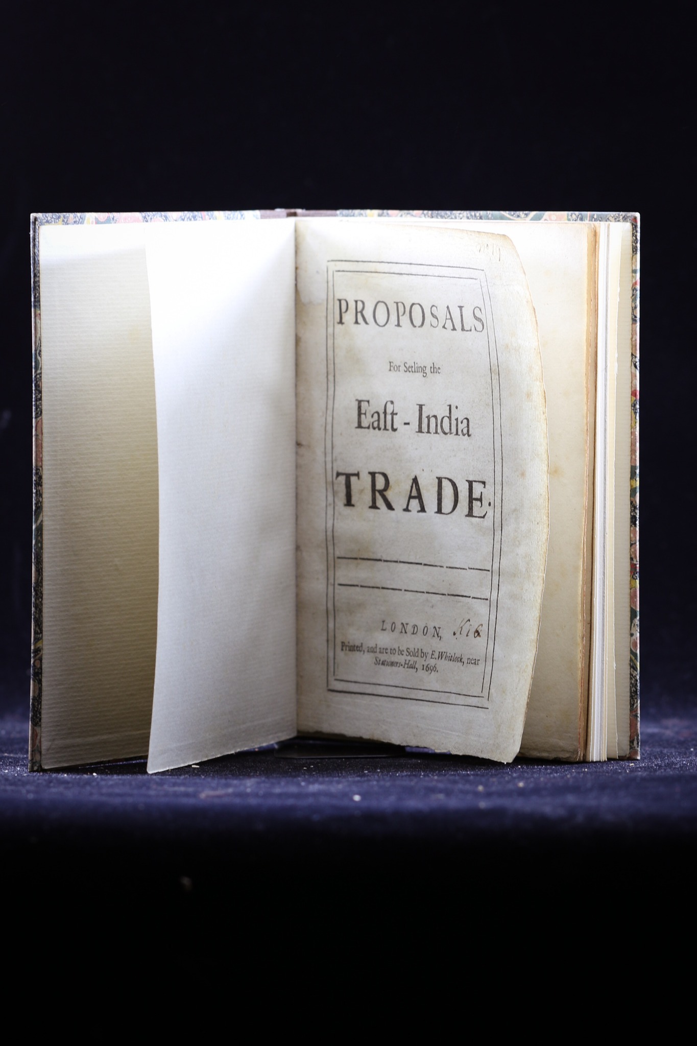 The East-India Trade. EAST INDIA COMPANY. Published by London: printed, and are to be sold by E. Whitlock, 1696 First edition of this anonymous contribution to the debate surrounding the East India Company, which had lost its monopoly on Indian trade in 1694 through the lobbying of merchants and ex-company members who wanted to enter the lucrative market themselves. The author offers their own solution - the formation of a regulated government company, one in which any Englishman could enter on an equal footing, and which can direct trade to the public good. The author asserts that at present no company can "prefer the Publick Good in Prejudice to their Joint Stock", that they only import and export that which will give them profits, and that they are guilty of "employing few others than Men of broken Fortunes, or Youths at very mean Salaries". In contrast, the author's envisioned company will "bring home much greater Quantities of all Commodities, imploy many of the Younger Sons of the Gentry. Encrease the Customs, and will in every Point be of Infinite Advantage to the Publick" (p. 22). ESTC R212949; Goldsmiths' 3233; Kress 1992; Wing P3745.