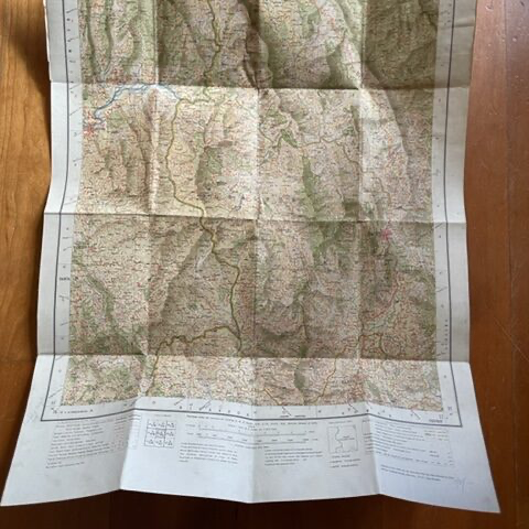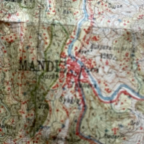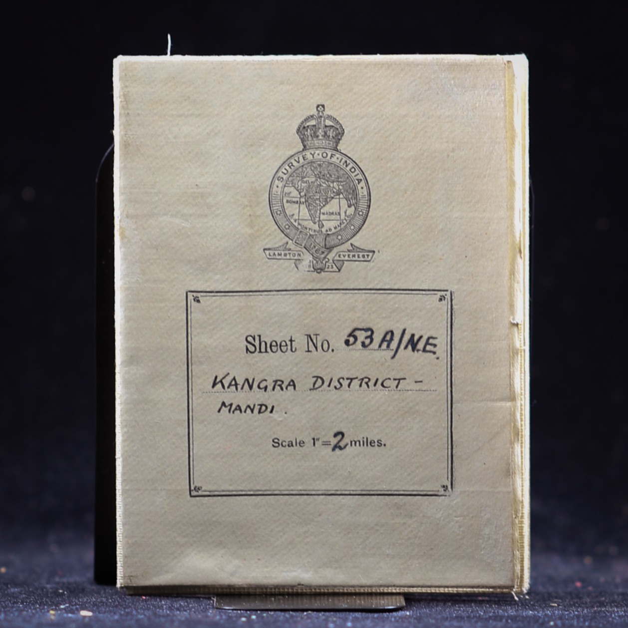 Kangra District folding map half inch map, 1923 Half inch map No 53 A/N.E. KANGRA DISTRICT, BILASPUR, MANDI AND SUKET STATES . Survey of India [Calcutta] 1923. A folding map, fully coloured and linen backed, on a scale of 1 inch to 2 miles of parts of Kangra District, Bilaspur, Mandi and Suket States, Punjab and Punjab States. The clean map is 22½ x 17½ ins unfolded and folds down to 5¾ x 4½ ins with old label. It extends from Cuma in Harabagh in the north to Baned in the south and from Sujanpur and Hamirpur in the west to just east of the state capital of Man di. The map is based on surveys on 1919-1920. Mandi was a Punjab Hill State whose rulers were often allied and linked by marriage to the state of Hutwa.
