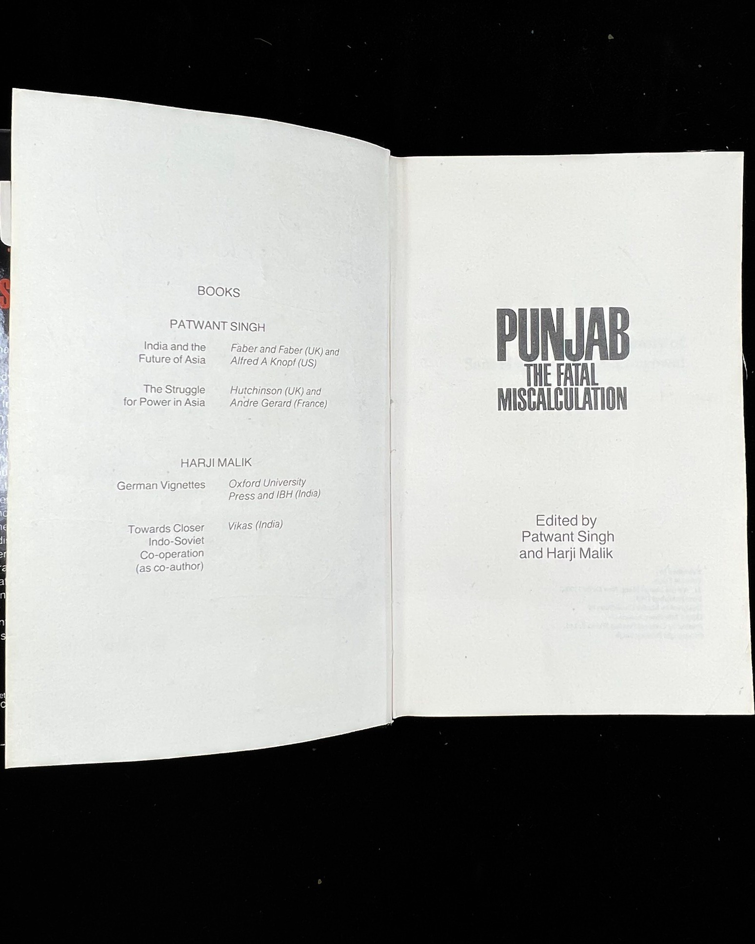 Singh, Patwant and Harji Malik Punjab: The Fatal Miscalculation, which was published in 1985. It mapped the manner in which Sikhs were alienated by the political miscalculations of the government in New Delhi in large part because of its inability to understand - or accept – their ideals and beliefs. For that reason, from around the early eighties till the late nineties, almost the entire focus of the books he wrote was on Sikhs and the Sikh religion.