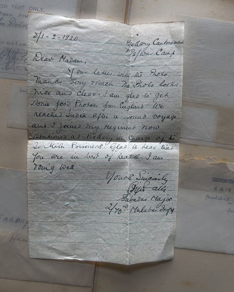 We are thrilled to share another extraordinary letter from our esteemed collection—this time, a precious gem from Punjabi Princess Sophia Duleep Singh's scrapbook. This page features a letter from Ajit Singh, Subedar Major of the 2/73rd Malabar Infantry, written during his tenure at Bellary Cantonment, P/S War Camp. Ajit Singh's letter eloquently conveys his deep admiration for Punjabi Princess Sophia Singh, the esteemed granddaughter of Sher-e-Punjab. He gratefully acknowledges receiving a photograph from her, capturing a moment during his visit to the United Kingdom, which holds profound significance as a cherished memento of their shared history. Notably, Ajit Singh also played a crucial role in overseeing the well-being of Turkish prisoners, exemplifying the vital contributions of Sikhs during World War I.