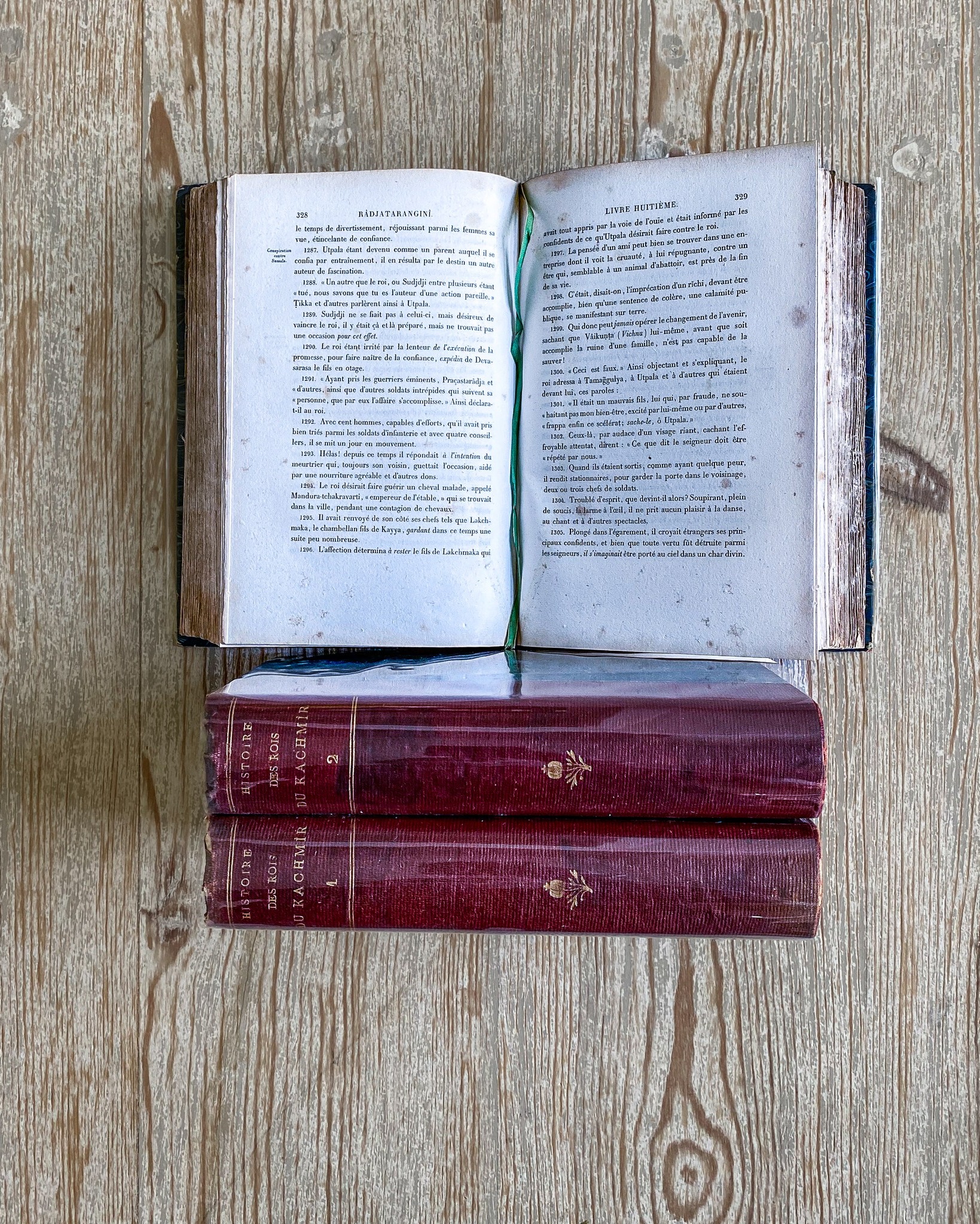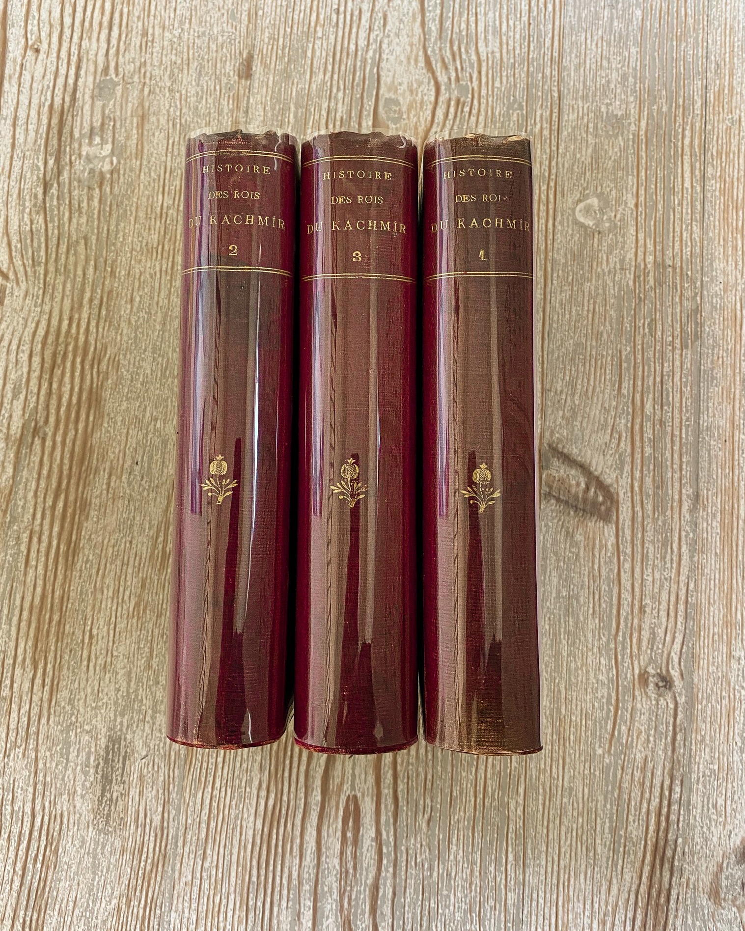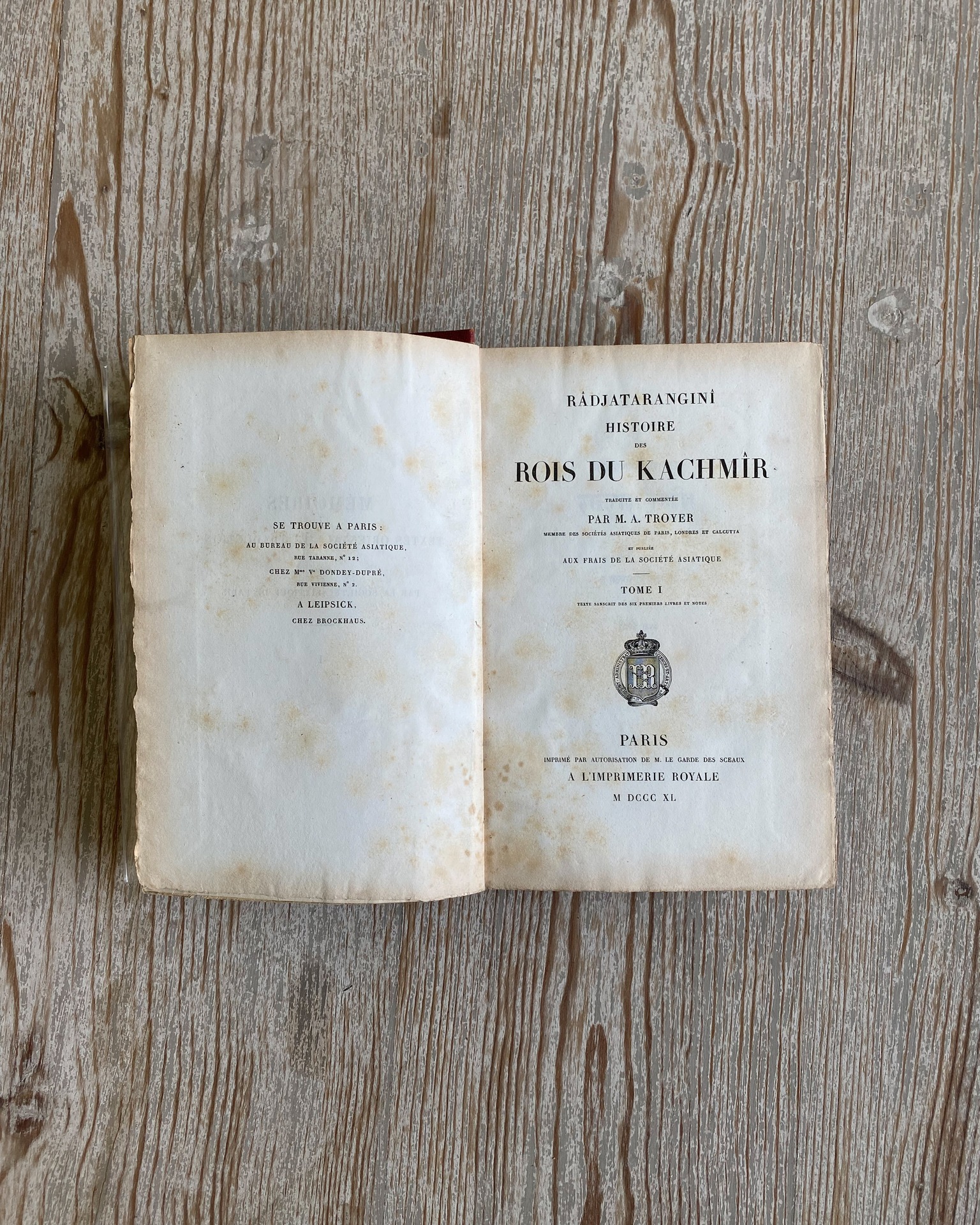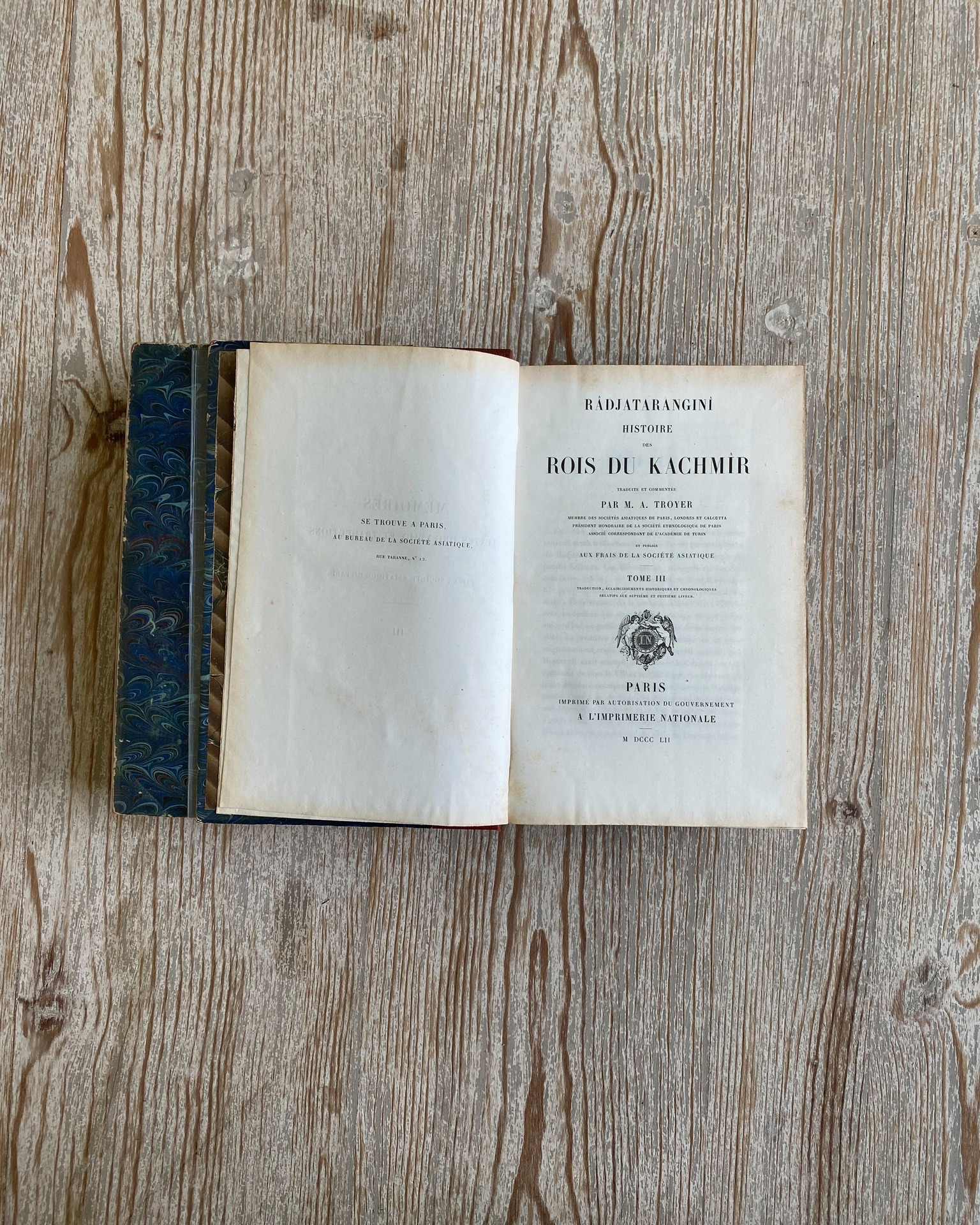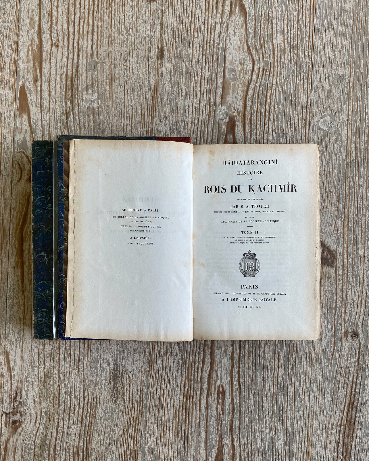 The Rajatarangini ("river of kings") was completed in 1148. A narrative poem in eight books, it recounts the history of Kashmir from the legendary period through the Utpala era (855-1003 CE) to the author's present day, and is a "valuable work for the political and social history of Kashmir, as well as the topography of that land" (Banerji). Little is known of the author's life, though he likely belonged the Brahmin caste, and expresses a certain affinity for Buddhism in his work, which was continued by several later chroniclers up to the Mughal conquest of Kashmir in the mid-sixteenth century. The editio princeps of the Rajatarangini, printed in Calcutta in 1835 from a manuscript discovered by English explorer William Moorcroft (1767-1825), is institutionally scarce (four copies in UK libraries, 16 world-wide), and untraced in commerce. Troyer was at the time principal of the Government Sanskrit College, Calcutta. His French translation and commentary is accompanied by the Sanskrit text of the first six books, which he revised by collating the Moorcroft manuscript with two copies in the library of the East India Company in London. The Rajatarangini did not become available in English until Stein's own translation in 1900. Banerji, A Companion to Sanskrit Literature, pp. 287-8. 3 volumes,