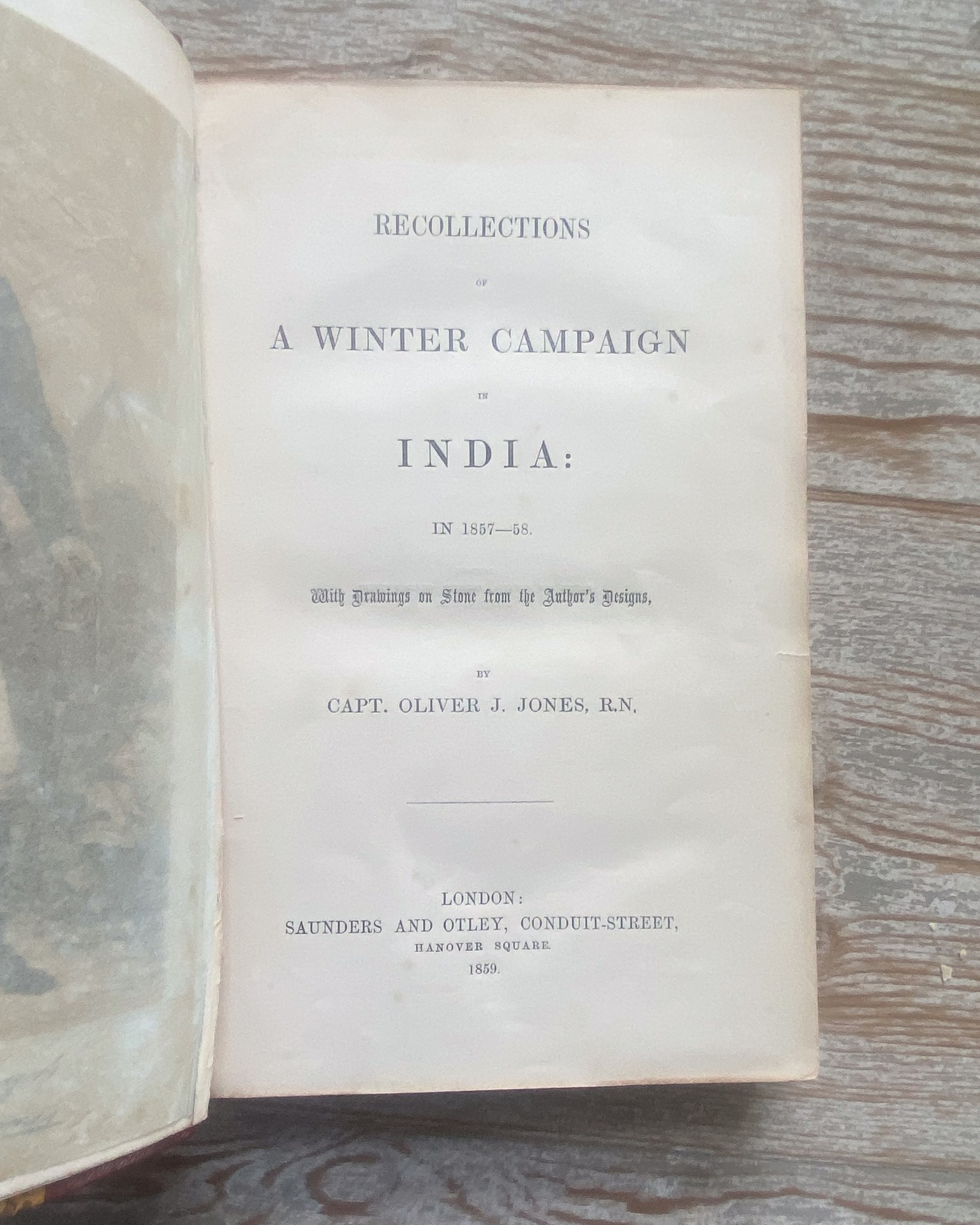Recollection Of A Winter Campaign In India by Capt Oliver J Jones R.N. Publication date 1859 We extend heartfelt gratitude to Paramjit Singh for facilitating the discovery of the remarkable 1859 'Recollections of a Winter Campaign in India' first edition This piece features the signature of the esteemed author, Captain Oliver J. Jones, R.N., and includes fifteen sepia lithograph views, along with exquisite costumes, plates, and two meticulously preserved plans. Once again, we want to express our deep appreciation for your invaluable contribution in uncovering this historical title.