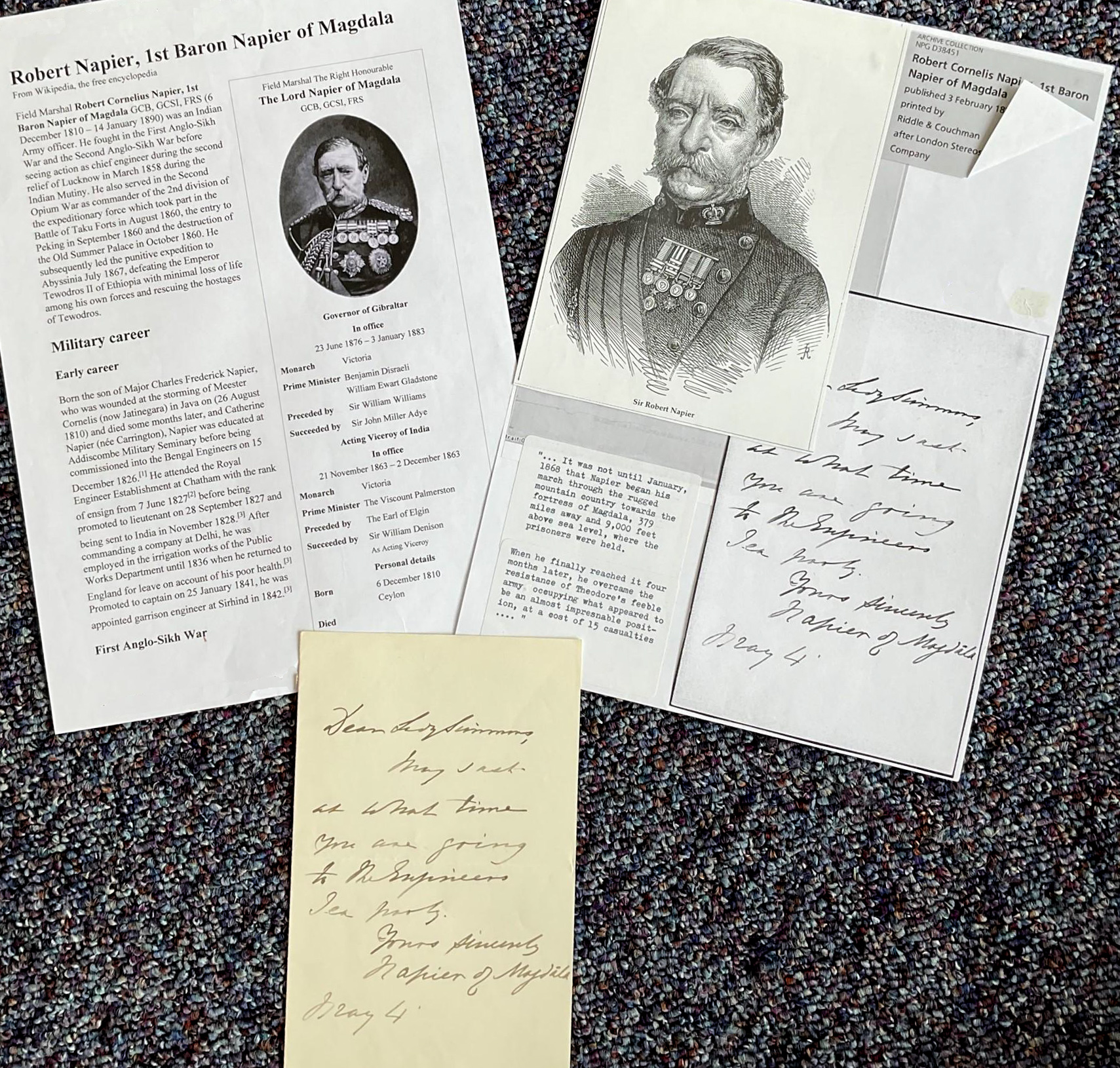 1st Baron Napier of Magdala Handwritten Letter Signed. (Signed in black ink) Field Marshal Robert Cornelis Napier, 1st Baron Napier of Magdala GCB GCSI FRS (6 December 1810 - 14 January 1890) was a British Indian Army officer. He fought in the First Anglo-Sikh War and the Second Anglo-Sikh War. He was promoted to brevet major on 3 April 1846,