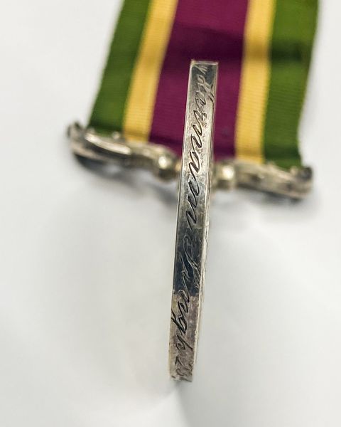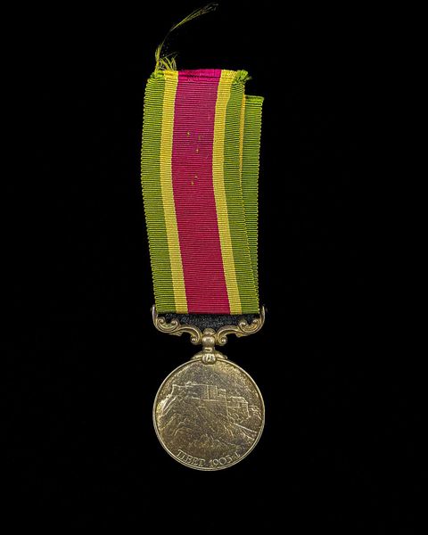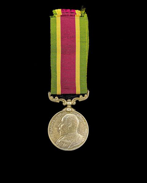 Tibet Medal 1903-1904, Silver issue, no clasp, awarded to a Sikh, Sepoy Harnam Singh, 23rd Sikh Pioneers, Indian Army, who saw service during the Tibet "Obverse design: King Edward VII, bust, in uniform (Field Marshal). "EDWARDVS VII KAISAR-I-HIND". Reverse design: fortress-city, Potala Lhassa, having ramparts and access steps, situated on a mountainous vantage point. Below the city, a cluster of trees. At the base of the design the text: "TIBET 1903-4". Suspender form: ornate scroll, swivel. Ribbon colours: green & white & maroon. Ribbon pattern: green/white/MAROON/white/green. Clasp (when awarded) form: straight bar with fish-tail ends and double raised edges outlining its shape, supported at each end by a rosette." "Lietunant Colonel Sir Francis Edward Young husband, with regiments of 23 Sikh Pioneers and 32 Sikh Pioneers, entered Tibet from Sikkim in the year 1904. They were successful in conquering the Gyantse Fort (which was built around 12th century) and made it their base from where they led further successful expeditions to Karo La pass (5,010 meter) and Lhasa. These may sound just names but having personally traveled to the heights around Karo La pass, due to thinness of air, I found it hard to carry my two heavy cameras. One can only imagine the feat for the soldiers at these heights, having to carry their weapons and backpacks.