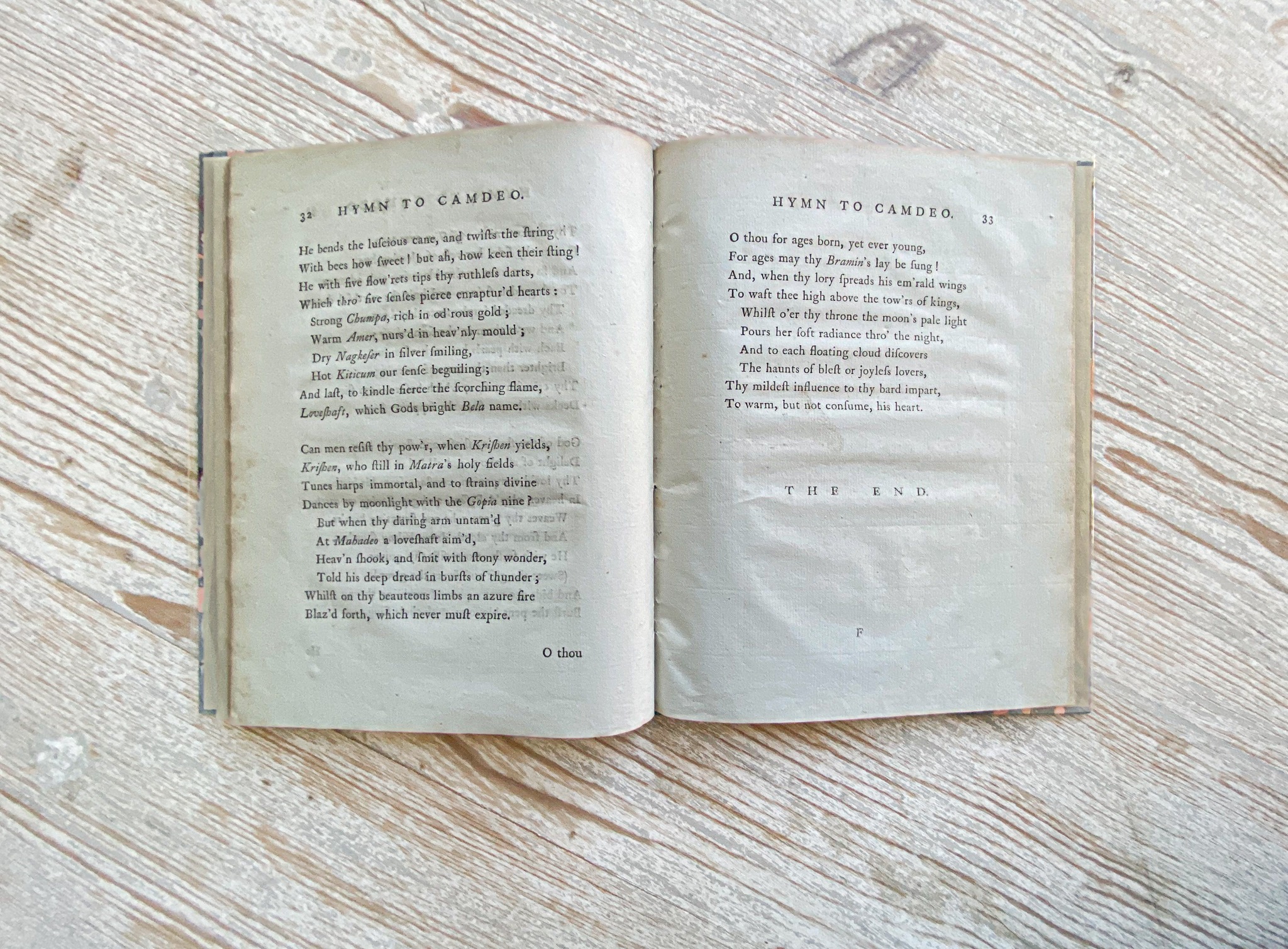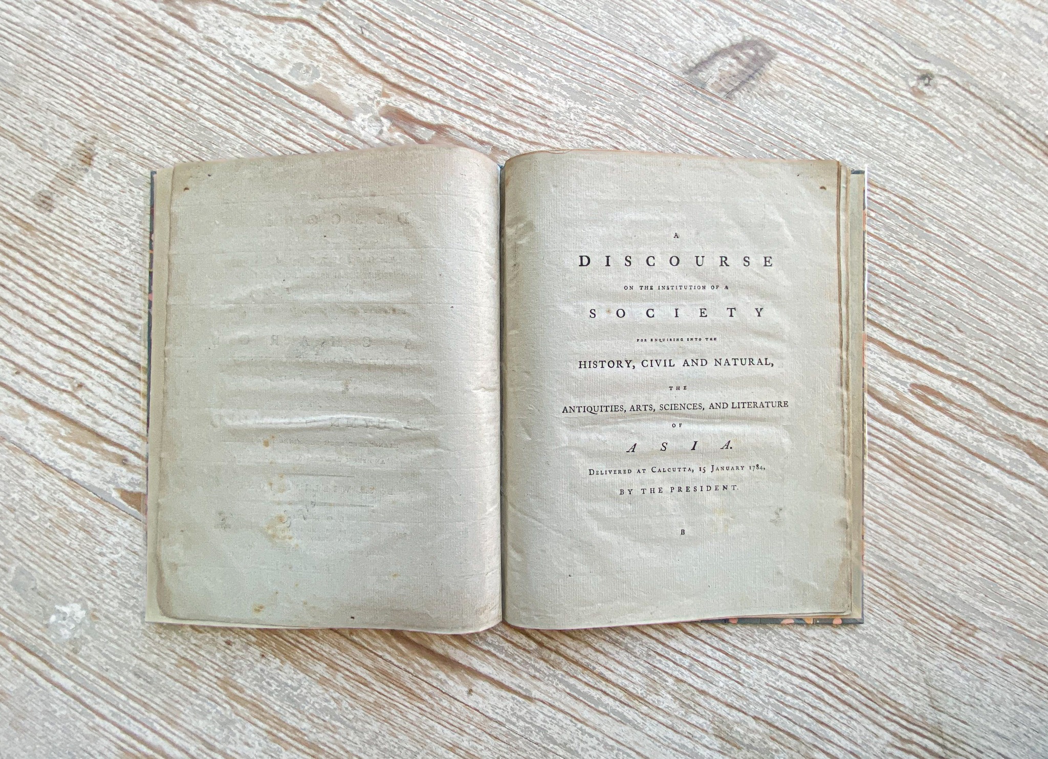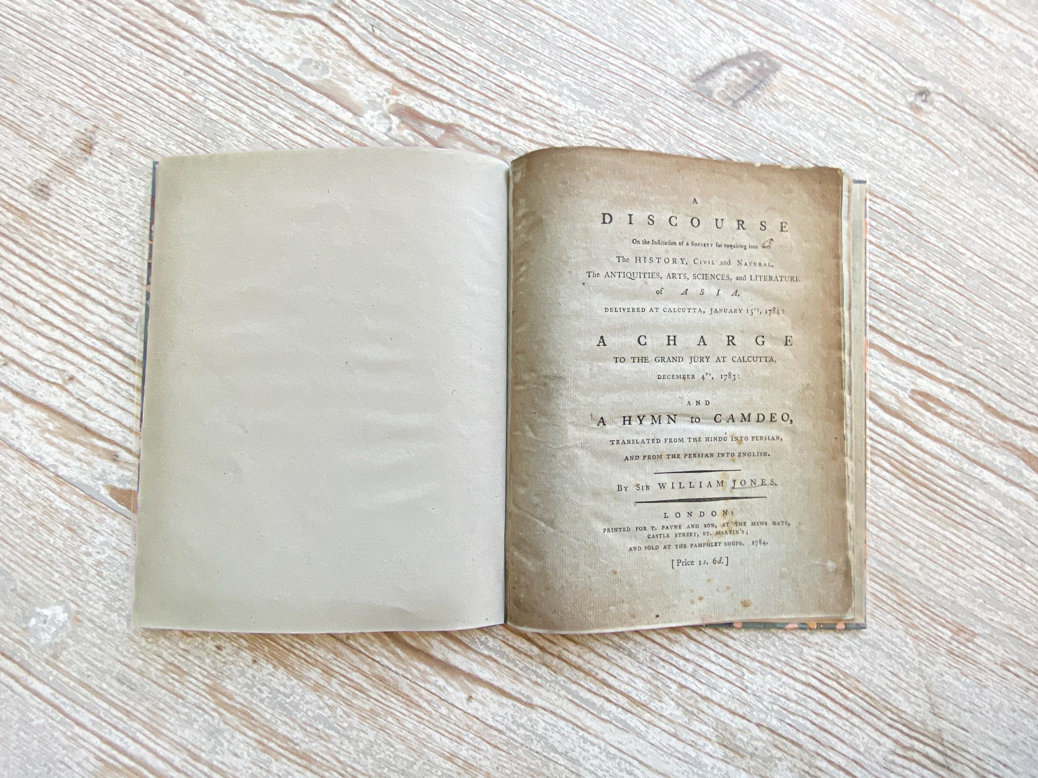 In his view, "an institutional so likely to afford entertainment and convey knowledge to mankind, will advance to maturity. as the Royal Society, which at first was only a meeting of a few literary friends at Oxford, rose gradually to that splendid zenith, at which a Halley was their Secretary, and a Newton their President" (ibid.) Among those present at the founding meeting was Charles Wilkins, the first translator of the Bhagavad Gita into English, while the pioneering Sanskrit scholar Alexander Hamilton was an early member. During Jones' (1746-1794) presidential tenure and after his death, the society's journal published many foundational texts of oriental studies. The crowning moment of his leadership was his 1786 address positing that the European Romance languages shared a common source with the languages of India and the Near East - "an imaginative leap which effectively marked the beginning of Indo-European comparative grammar and modern comparative-historical linguistics" (ibid.)Jones numbers among British history's most distinguished philologists. As a child at private school, he showed a remarkable aptitude for languages, learning Arabic and Hebrew and becoming more proficient in classical Greek than the school headmaster. By the 1770s, he was immersed in Britain's academic milieux; Dr Johnson admitted him to the prestigious Turk's Head Club in 1773, where he socialised with the likes of Edmund Burke, Edward Gibbon, and David Garrick. With his aptitude for oriental languages, he was appointed a judge in Calcutta in 1783, where he stayed until his death. Printed with Jones's Discourse are two additional short texts: a speech he made as judge in late 1783, and his translation of the Hindu "Hymn to Camdeo" which was completed shortly before the Asiatick Society's founding. ESTC, T31990. Michael J. Franklin, 'Orientalist Jones': Sir William Jones, Poet, Lawyer, and Linguist, 1746-1794.