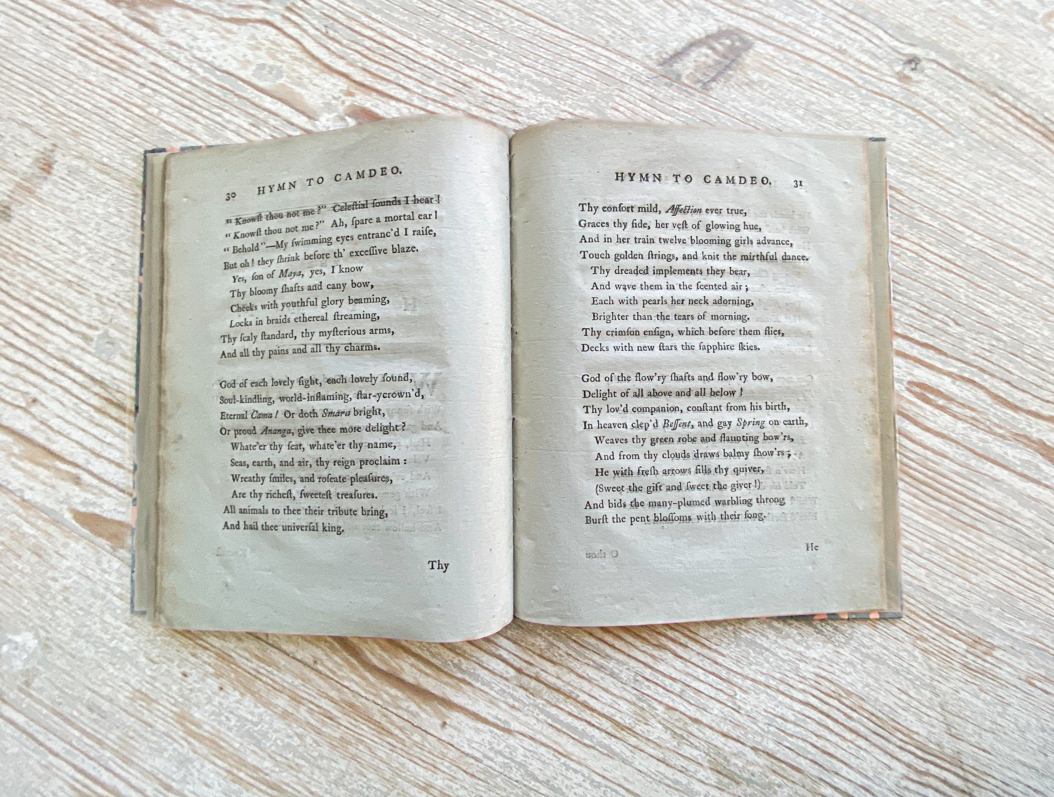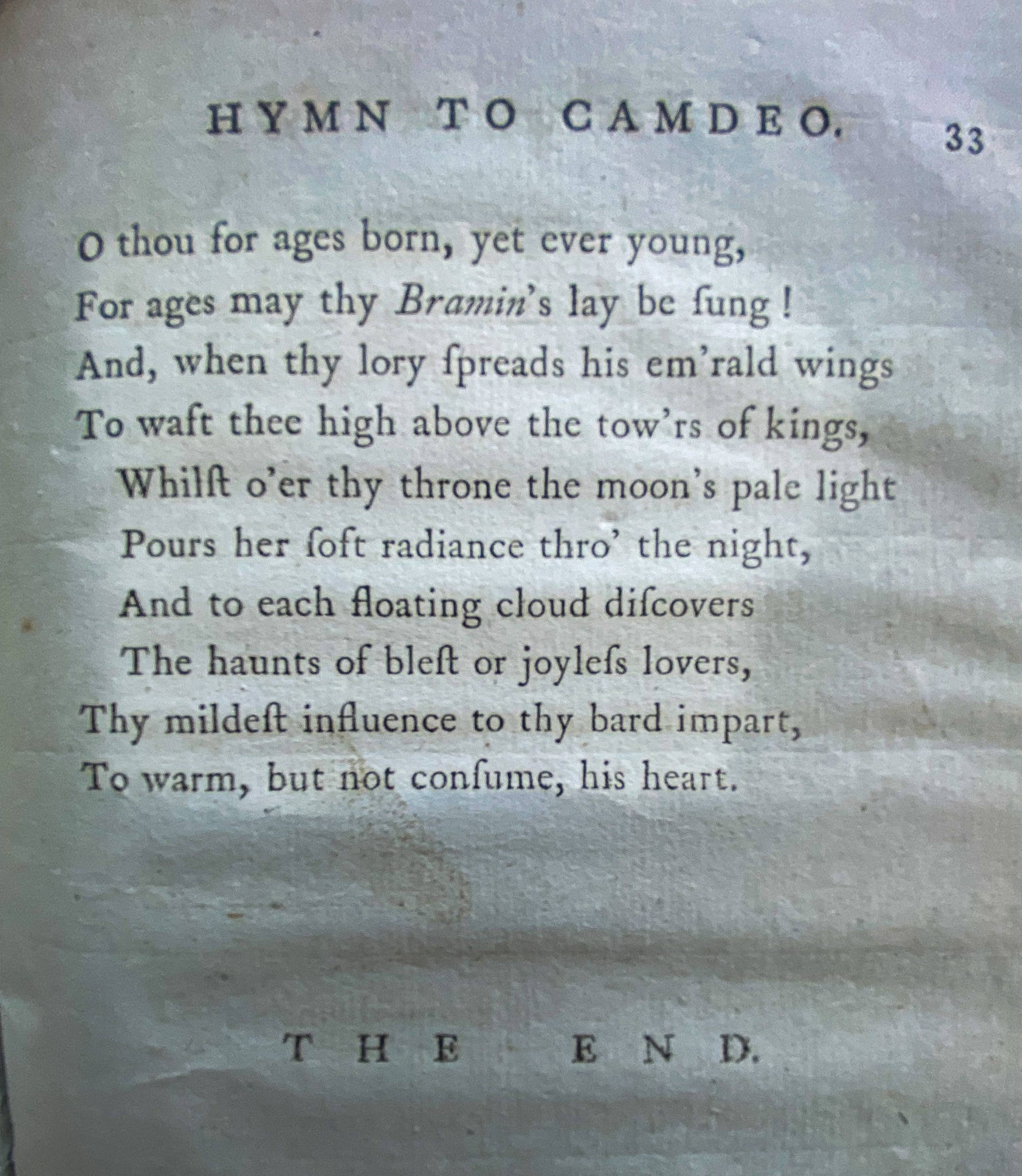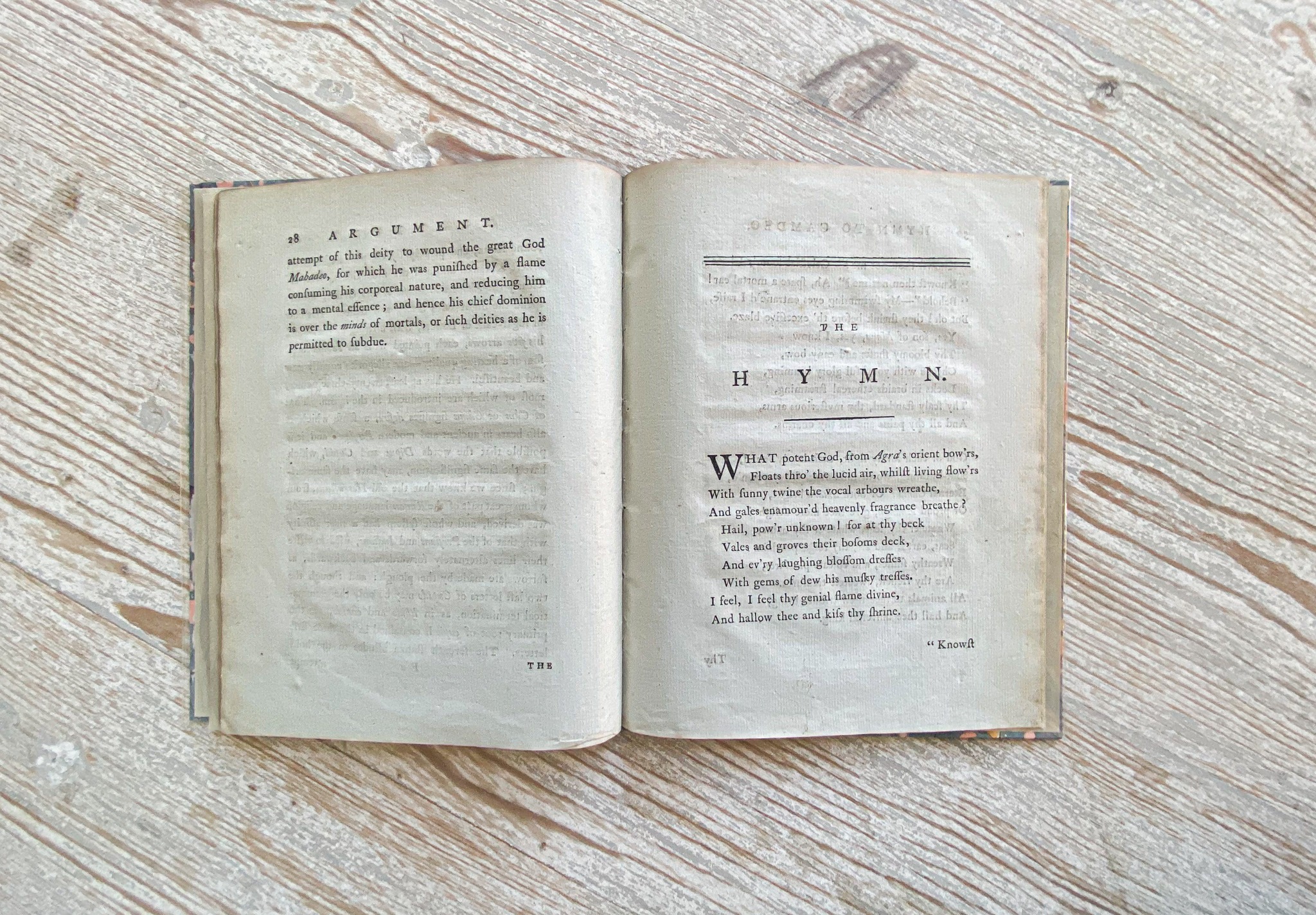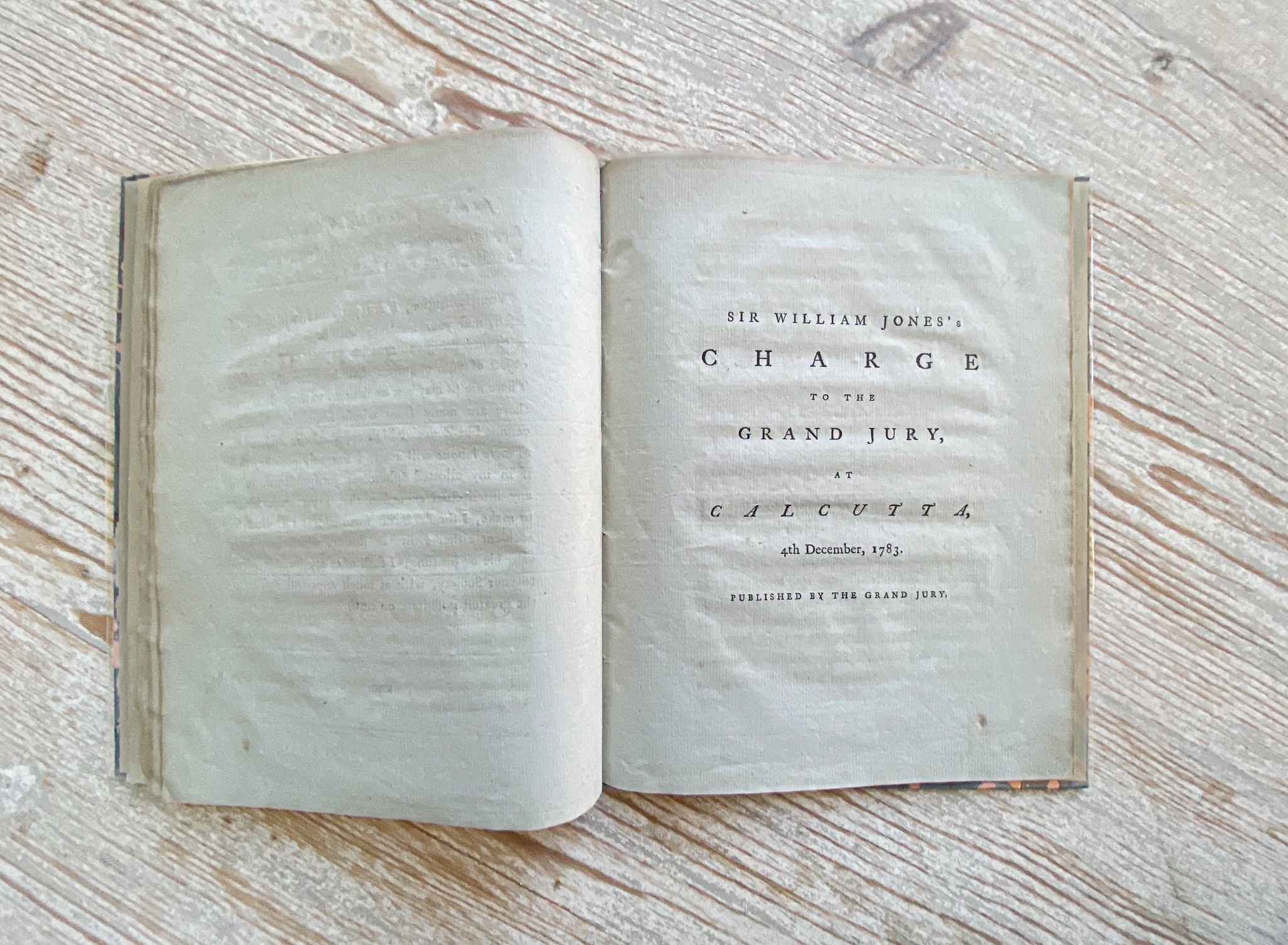 In his view, "an institutional so likely to afford entertainment and convey knowledge to mankind, will advance to maturity. as the Royal Society, which at first was only a meeting of a few literary friends at Oxford, rose gradually to that splendid zenith, at which a Halley was their Secretary, and a Newton their President" (ibid.) Among those present at the founding meeting was Charles Wilkins, the first translator of the Bhagavad Gita into English, while the pioneering Sanskrit scholar Alexander Hamilton was an early member. During Jones' (1746-1794) presidential tenure and after his death, the society's journal published many foundational texts of oriental studies. The crowning moment of his leadership was his 1786 address positing that the European Romance languages shared a common source with the languages of India and the Near East - "an imaginative leap which effectively marked the beginning of Indo-European comparative grammar and modern comparative-historical linguistics" (ibid.)Jones numbers among British history's most distinguished philologists. As a child at private school, he showed a remarkable aptitude for languages, learning Arabic and Hebrew and becoming more proficient in classical Greek than the school headmaster. By the 1770s, he was immersed in Britain's academic milieux; Dr Johnson admitted him to the prestigious Turk's Head Club in 1773, where he socialised with the likes of Edmund Burke, Edward Gibbon, and David Garrick. With his aptitude for oriental languages, he was appointed a judge in Calcutta in 1783, where he stayed until his death. Printed with Jones's Discourse are two additional short texts: a speech he made as judge in late 1783, and his translation of the Hindu "Hymn to Camdeo" which was completed shortly before the Asiatick Society's founding. ESTC, T31990. Michael J. Franklin, 'Orientalist Jones': Sir William Jones, Poet, Lawyer, and Linguist, 1746-1794.
