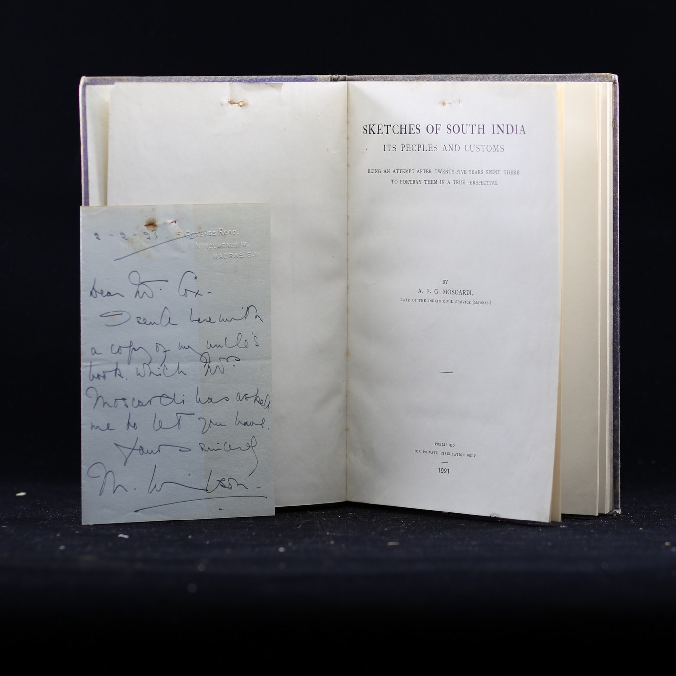 ( With a personal note ,rare) Sketches of South India its Peoples and Customs , being an attempt after twenty-five years spent there, to portray them in a true perspective Moscardi, A.F.G. Published by Published privately, Madras, 1921