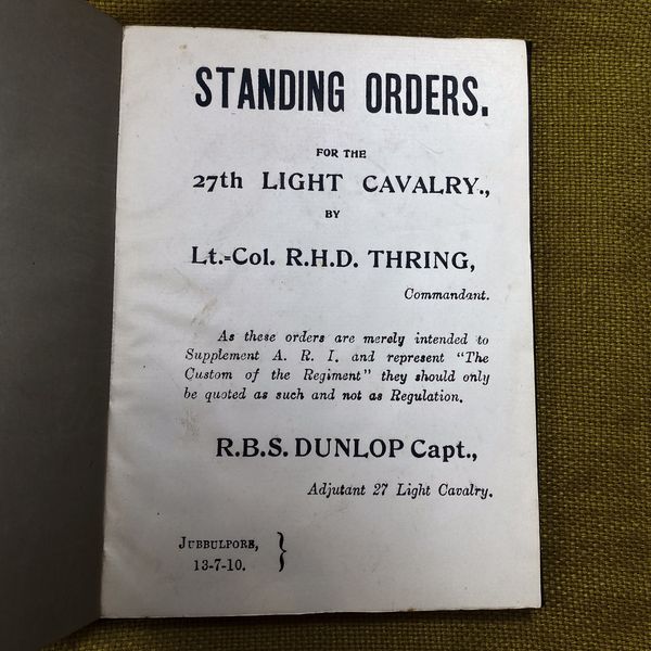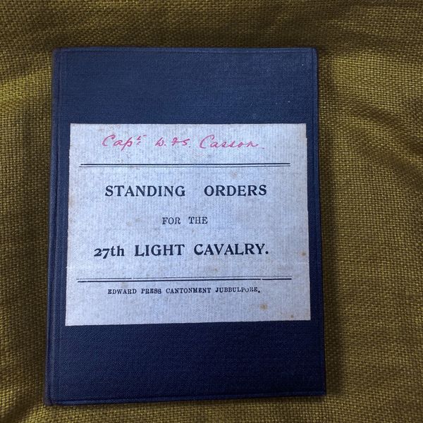 Standing Orders For the 27th Light Cavalry., By Lt. Col. R.H.D. Thring,Commandant. "As these orders are merely intended to supplement A. R. I. and represent "The Custom of the Regiment" they should only be quoted as such and not as Regulation. R.B.S. Dunlop Capt.," Adjutant 27 Light Cavalry. Jubbulpore, 13-7-1910. We need your assistance in unraveling the mystery behind a handwritten inscription by Capt. W.T.S. Carson. If you have any information or insights about Capt. Carson or the historical context surrounding this book, please reach out.