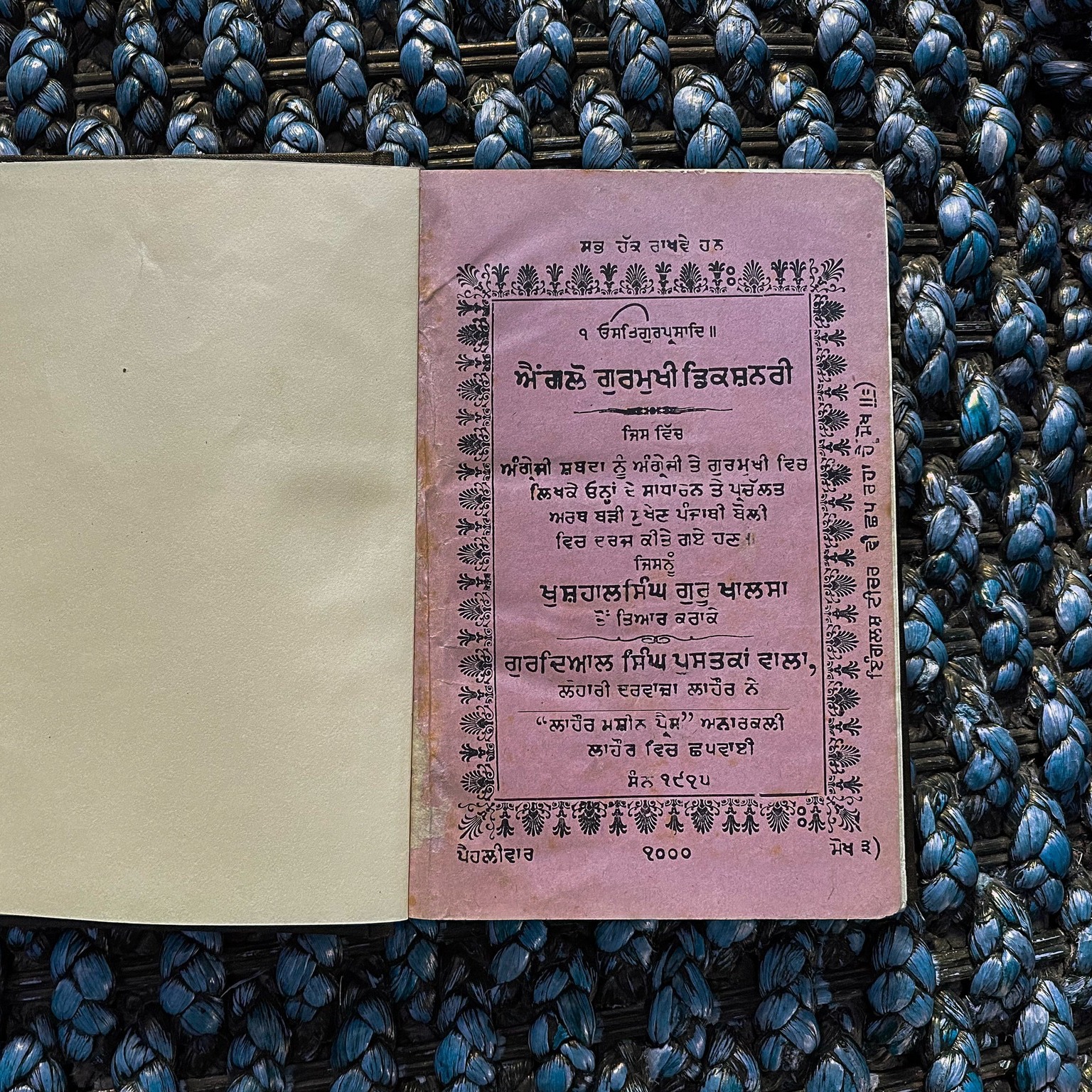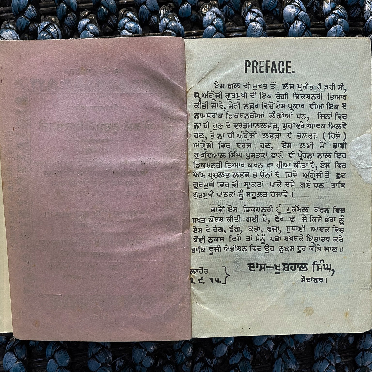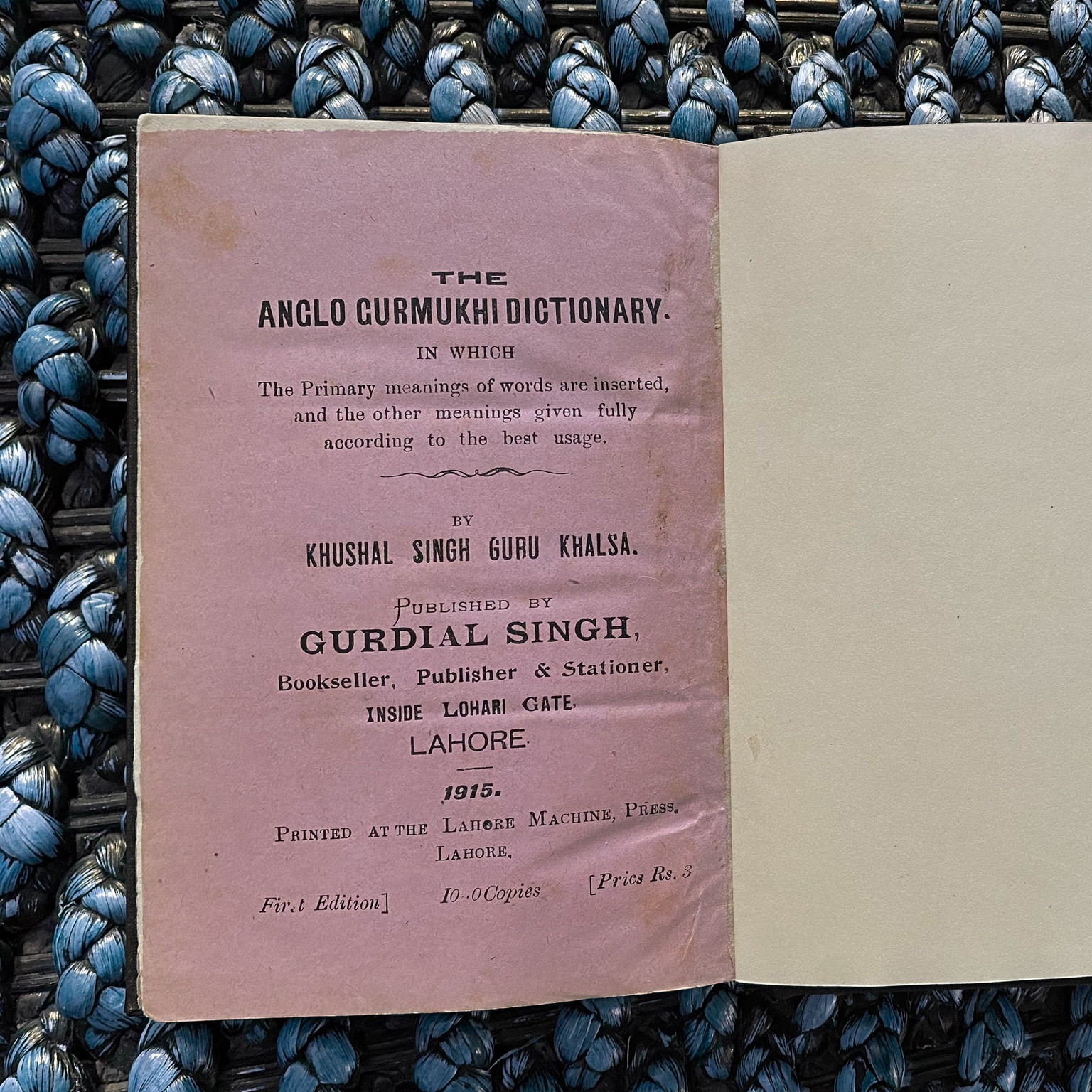 (Rare Copy , Printed in 1915) By S. Khushal Singh Guru Khalsa The Anglo Gurmukhi Dictionary. In which the primary meanings of words are inserted and the other meanings given fully according to the best usage. Published by Gurdial Singh Bookseller, Publisher & Stationer INSIDE LOHARI GATE, Printed at Lahore Machine Press LAHORE, KHUSHAL SING GURU KHALSA.