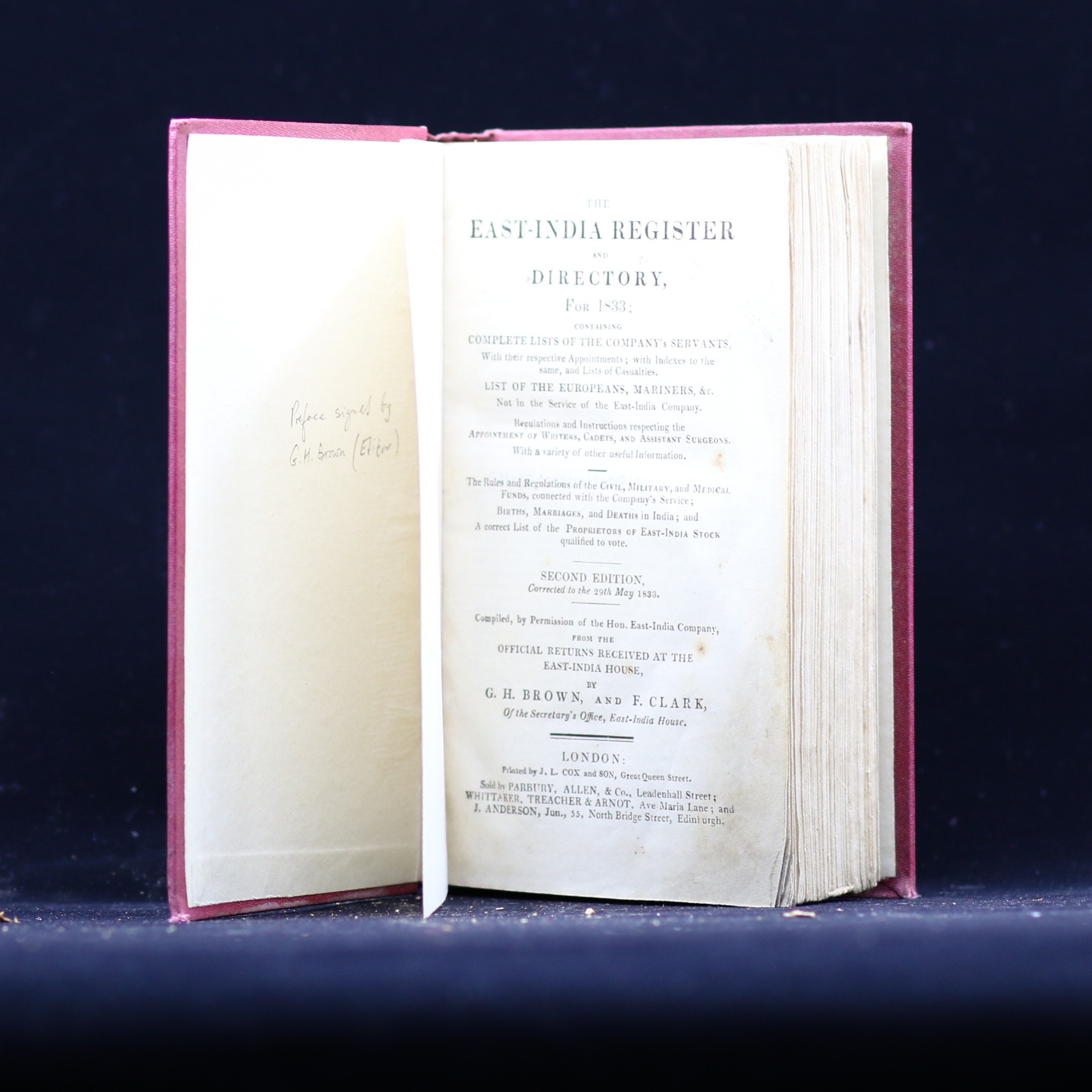 The East India Register and Directory for 1833 (Corrected to 29th May, 1833), Containing Complete Lists of the Company’S Servants, with Their Respective Appointments with Indexes to the Same, and Lists of Casualties , List of the Europeans, Mariners... Description: London: G. H. Brown & F. Clark. First Edition. Hard Cover. First Printing of the second corrected edition for May 1833