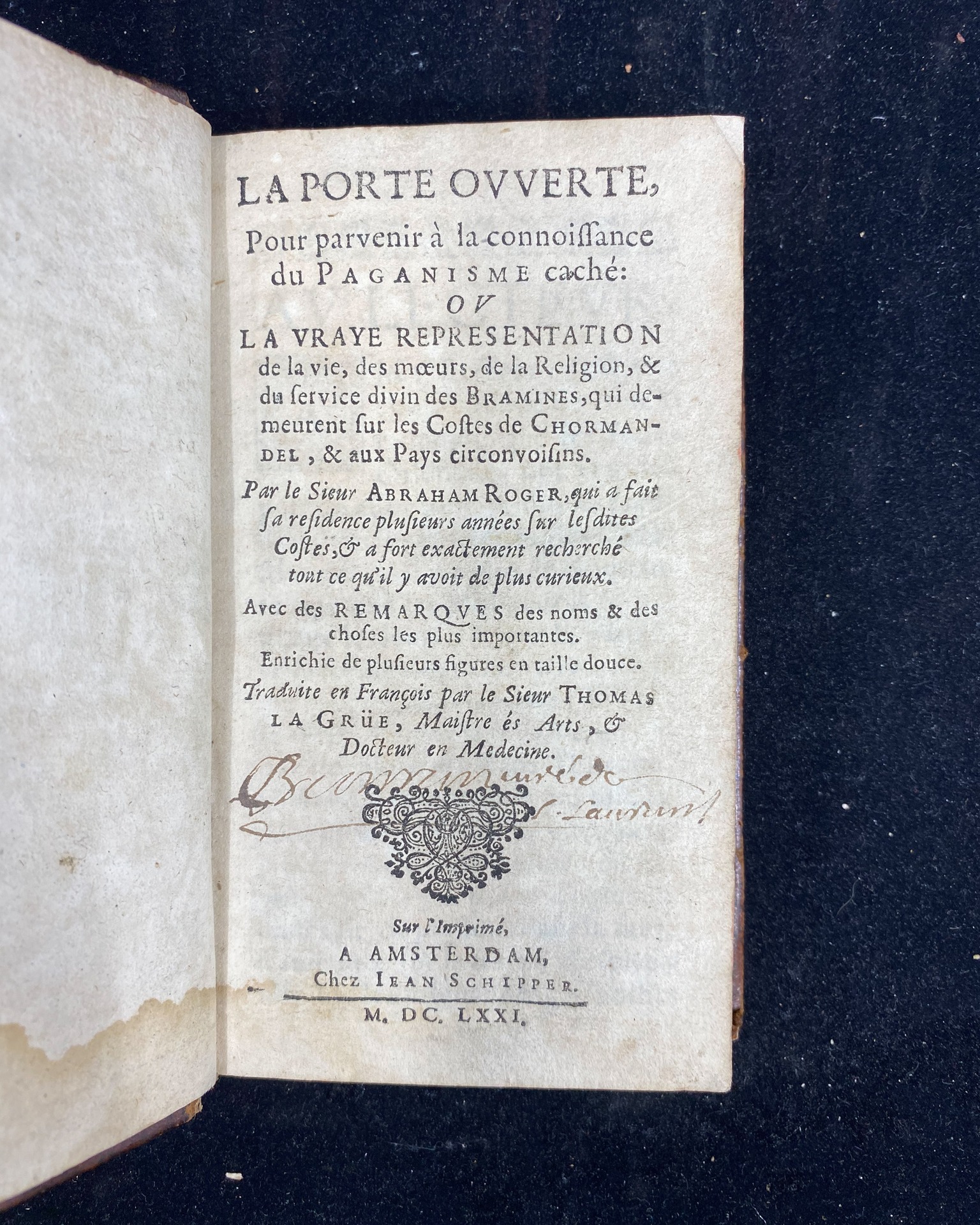 Printed in 1671 The open door, to achieve knowledge of hidden paganism or The uraye representation of the life, customs, religion & divine service of the Bramins, who live on the coasts of Chormandel & in the surrounding countries Rogerius, Abraham Published by Iean Schipper, 1671 La porte ouverte, pour parvenir á la connoissance du paganisme caché ou La uraye representation de la vie, des moeurs, de la religion & du service divin des bramines, qui demeurent sur les costes de Chormandel & aux pays circonvoisins ROGERIUS, Abraham Published by Iean Schipper, 1671 Description: 1671 Open Door to PAGAN Secrets HINDU India Brahmin Bizarre Demon Rites Roger Abraham Rogerius was a 17th-century Dutch writer known for being one of the first Europeans to write extensively on Hinduism and Indian cultures. In his book The Open Door to the Secrets of Paganism , Rogerius describes his ministry among the Tamil and Brahmin people in Southern India. His work deals with the life of the Brahmins as well as their Hindu worship practices, superstitions, and deities, along with numerous Sanskrit aphorisms. The illustrated title page depicts bizarre sacrificial rituals under the watchful eye of a demon.