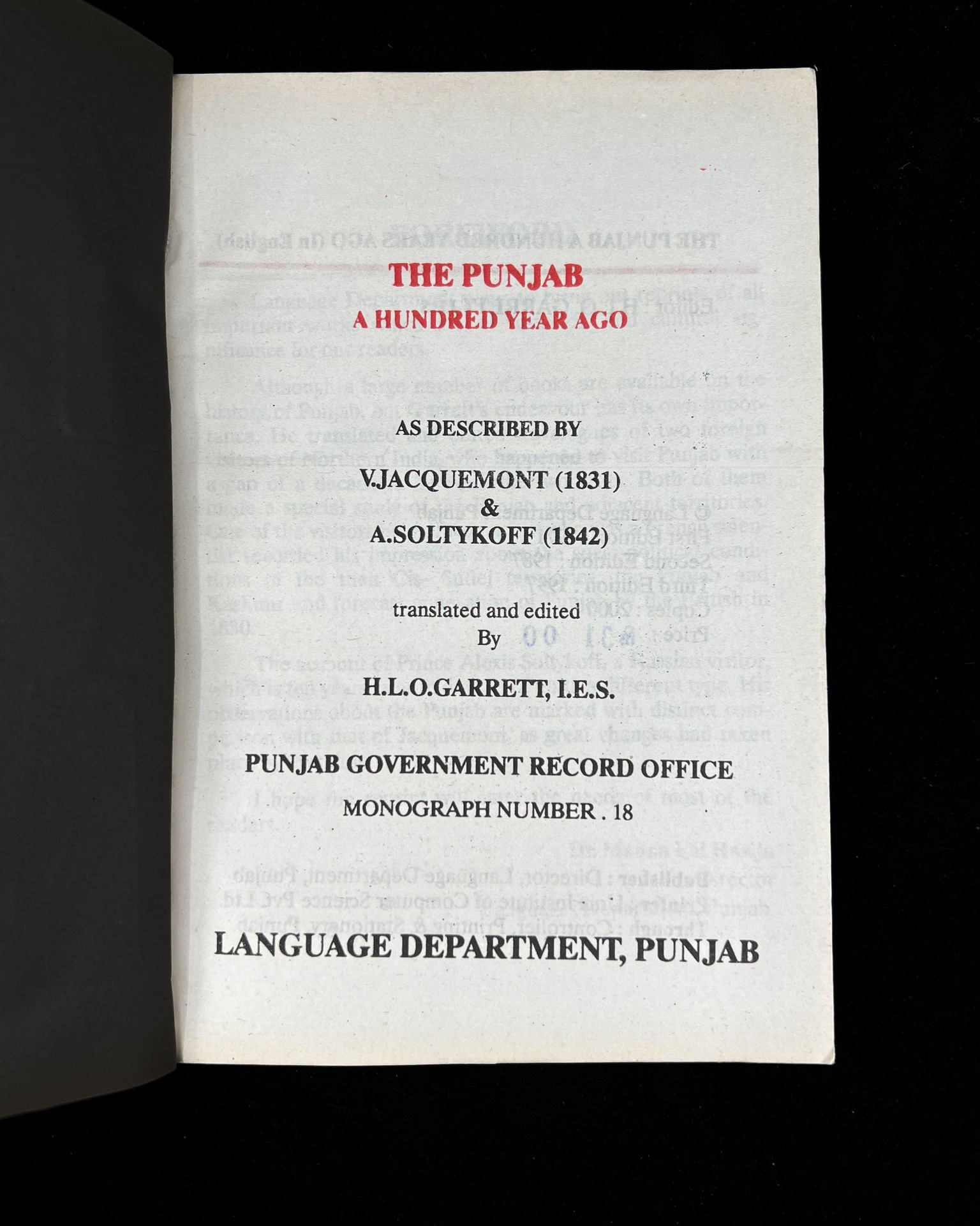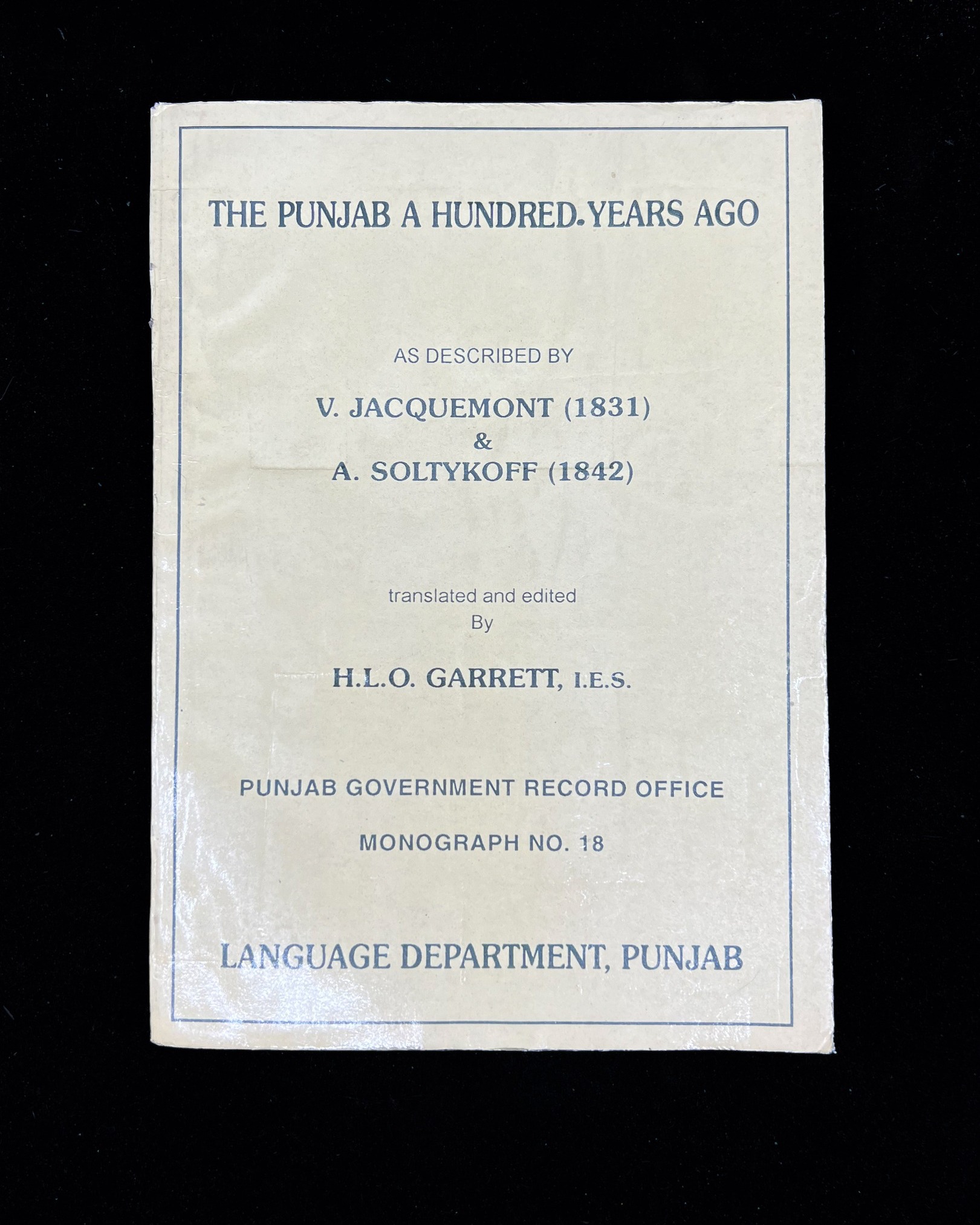The Punjab of a Hundred Years Ago as Described by V. Jacquemont (1831) and A. Soltykoff (1842), Lahore: Punjab Government Record Office Publications, Monograph No. 18, 1935. The Russian traveller, writer and artist, Prince Alexis Soltykoff (1806-1859) made several journeys to India and Sri Lanka between 1841 and 1846, where he produced exquisite drawings of the people, landscapes, processions, hunting scenes and ceremonies. These drawings were later published and became an instant success, earning the prince the title of 'The Indian' amongst his friends in the Russian and French aristocracy. Jacquemont was a French botanist and geologist. He travelled to India in 1828, and remained there for the rest of his life. He visited Amber in Rajputana, met with the Sikh ruler Ranjit Singh at his capital Lahore, and visited the kingdom of Ladakh in the Himalayas. He also visited Bardhaman in Bengal in November 1829. He died of cholera in Mumbai on December 7, 1832.