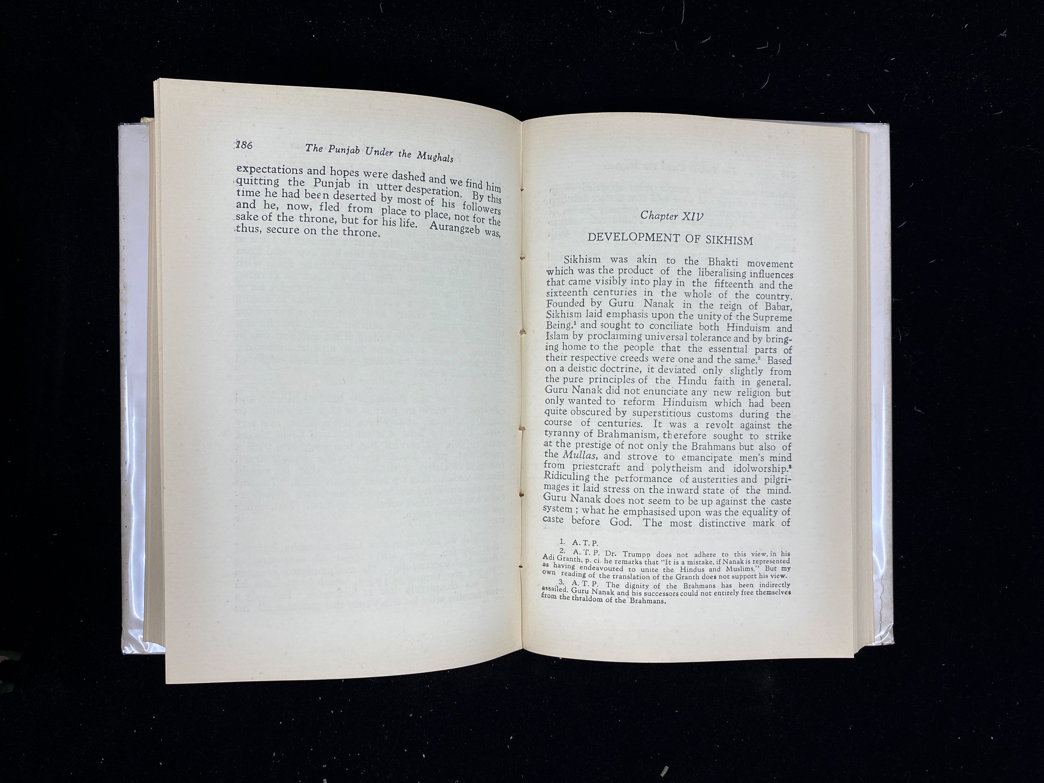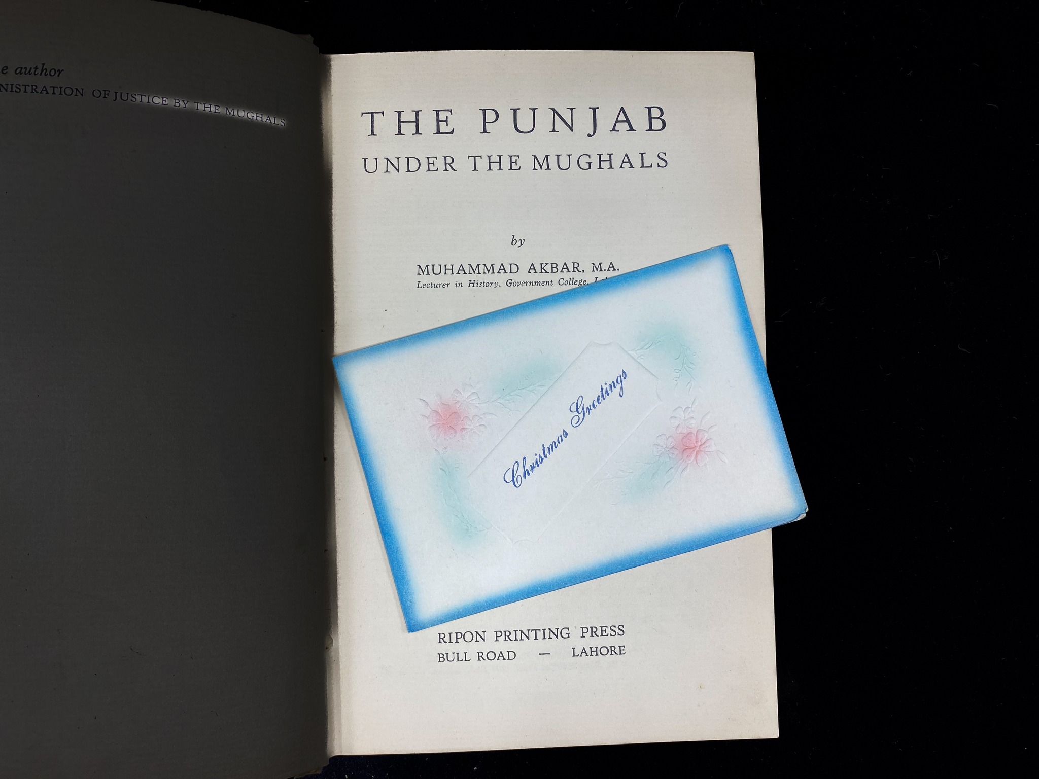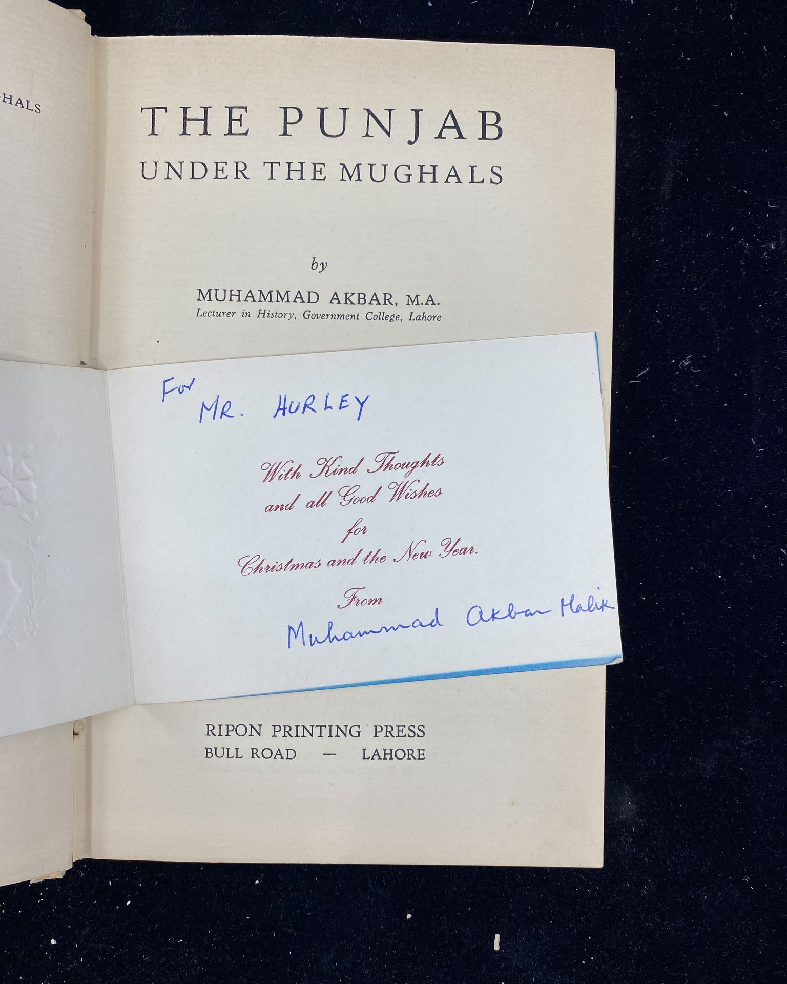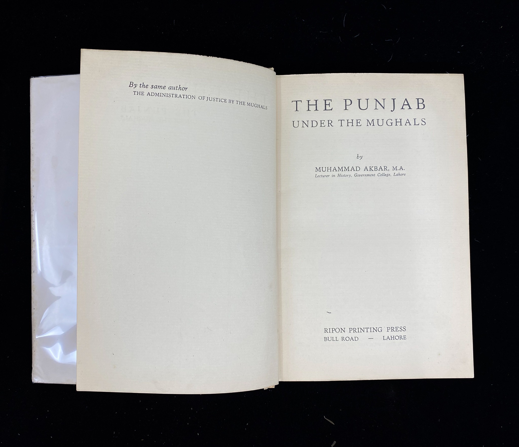 ( Christmas card from the author included, signed Muhammad Akbar Malik) Chapter I : The land and the people -- Chapter II : Akbar's accession and early difficulties Chapter III : Bairam Khan's Rebellion -- Chapter IV : Husain Quli Khan and Shah Quli Khan - Chapter V : Said Khan 1578-1585 -- Chapter VI : Lahore as the Imperial headquarters, 1585-1598 -- Chapter VII : Jahangir's accession -- Chapter VIII : A note on the law of succession Chapter IX : Khusrau's rebellion -- Chapter X : Conquest of Kangra -- Chapter XI : Mahabat Khan and Nur Jahan -- Chapter XII : The Punjab under Shah Jahan -- Chapter XIII : The Punjab and the war of succession Chapter XIV : Development of Sikhism -- Chapter XV : Aurangzeb and Sikh Gurus -- Chapter XVI : Guru Govind Singh -- Chapter XVII ; The Feudatory states of the Punjab - Chapter XVIII : Economic and Cultural Life.