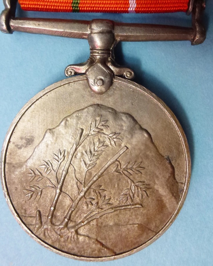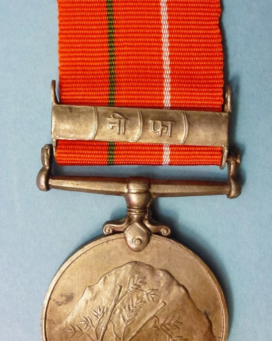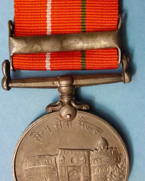Named on Rim An original full size award in cupro nickel measuring 1.3/8th inches in diameter 36mm) and in very fine condition. It is complete with original correct ribbon. The rim is officially impressed with the details of the recipient. " 3349750. L-Nk. Jaspal Singh. Sikh.R.". ( L-Nk = Lance Corporal. Sikh R. = Sikh Rifles). Obverse - The face of the mountain Nanda Devi with bamboo in the foreground Reverse - The gateway to an ancient Indian fort, inscribed above in Hindi ‘Sainya Seva Medal’