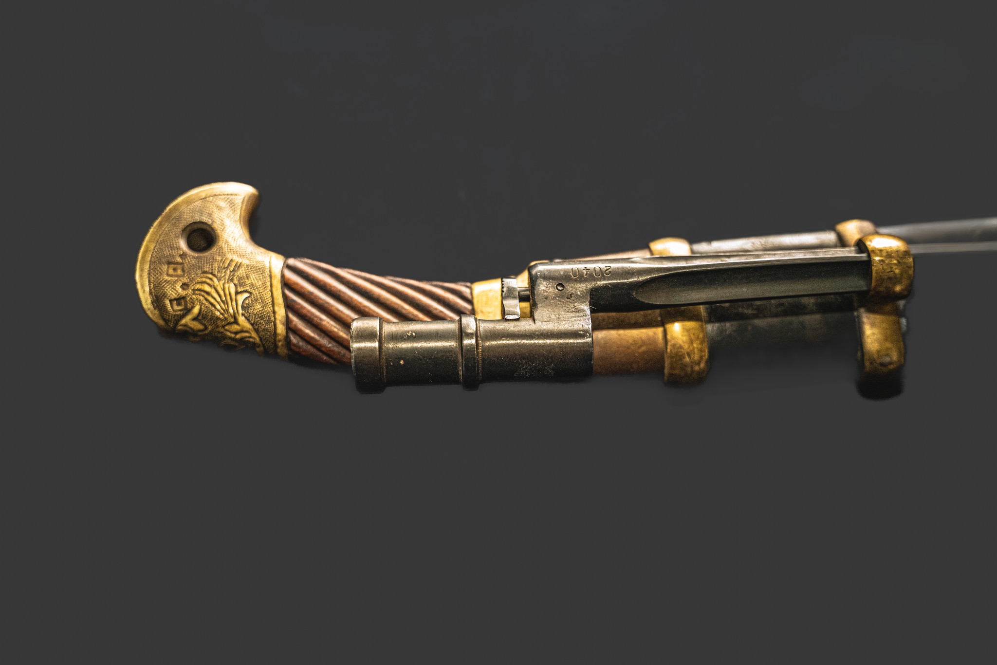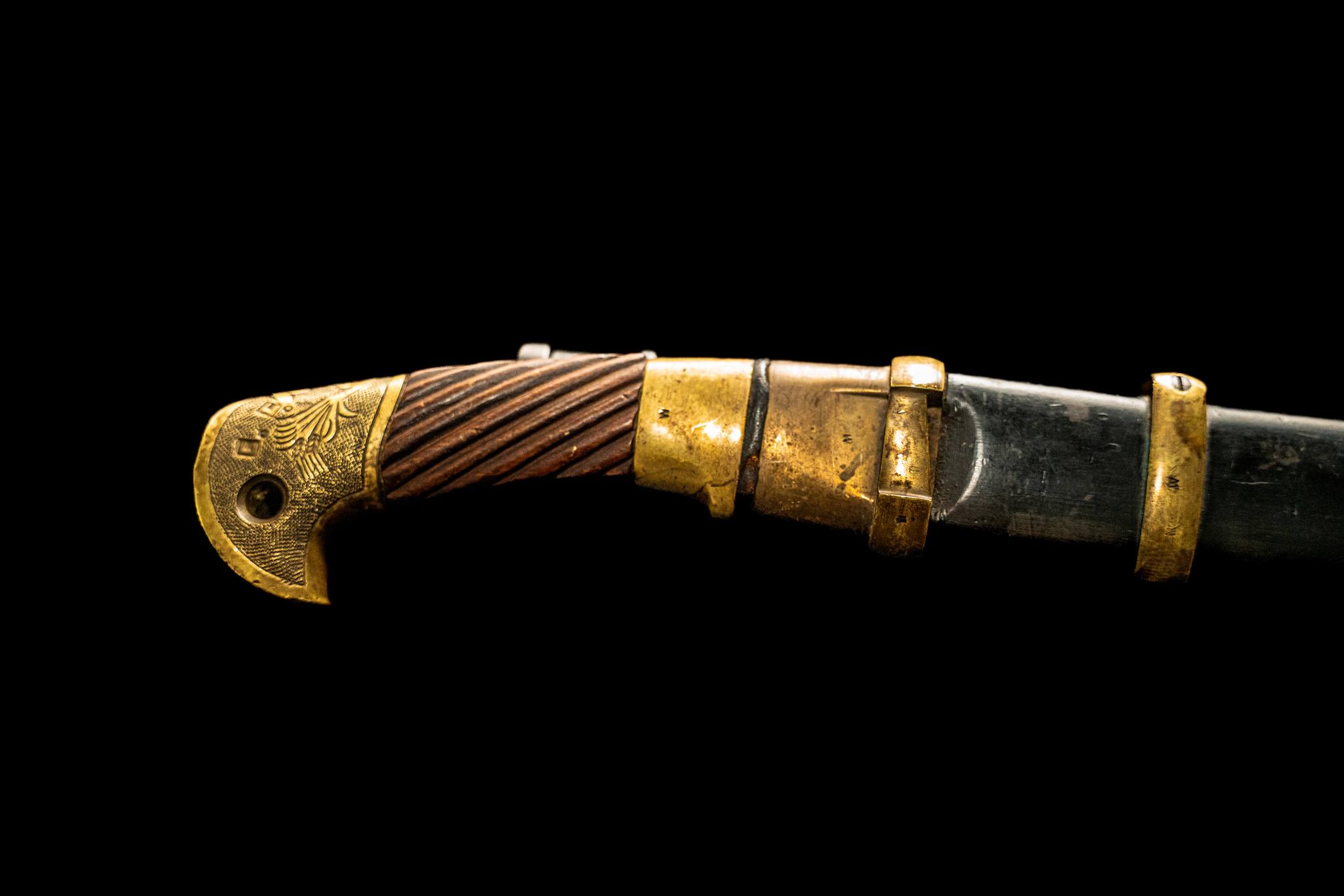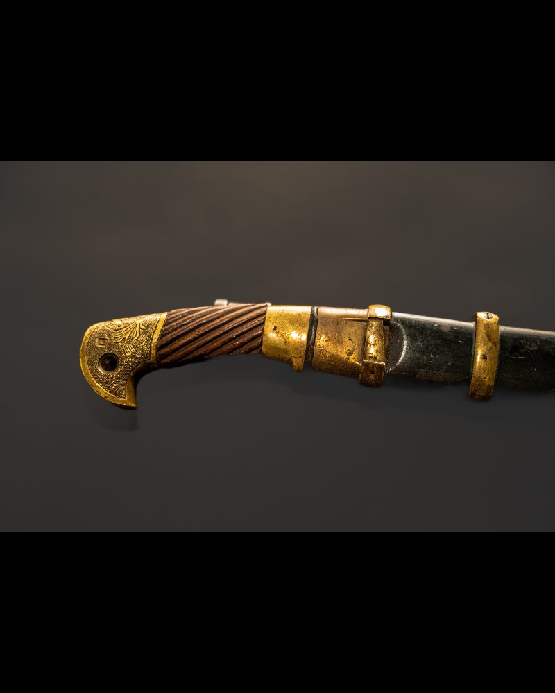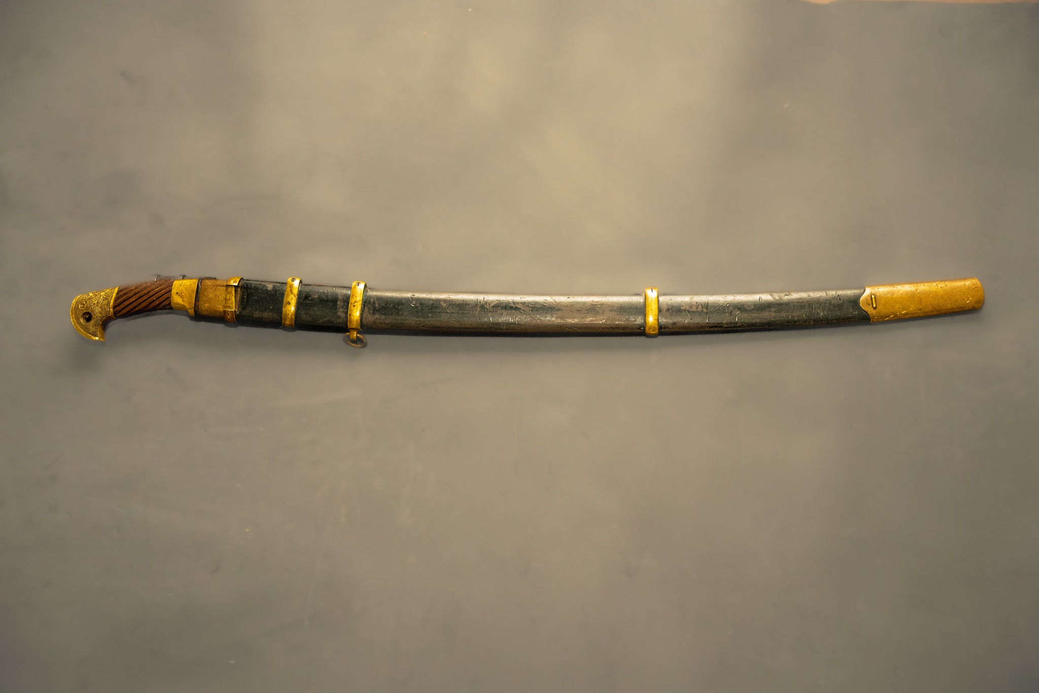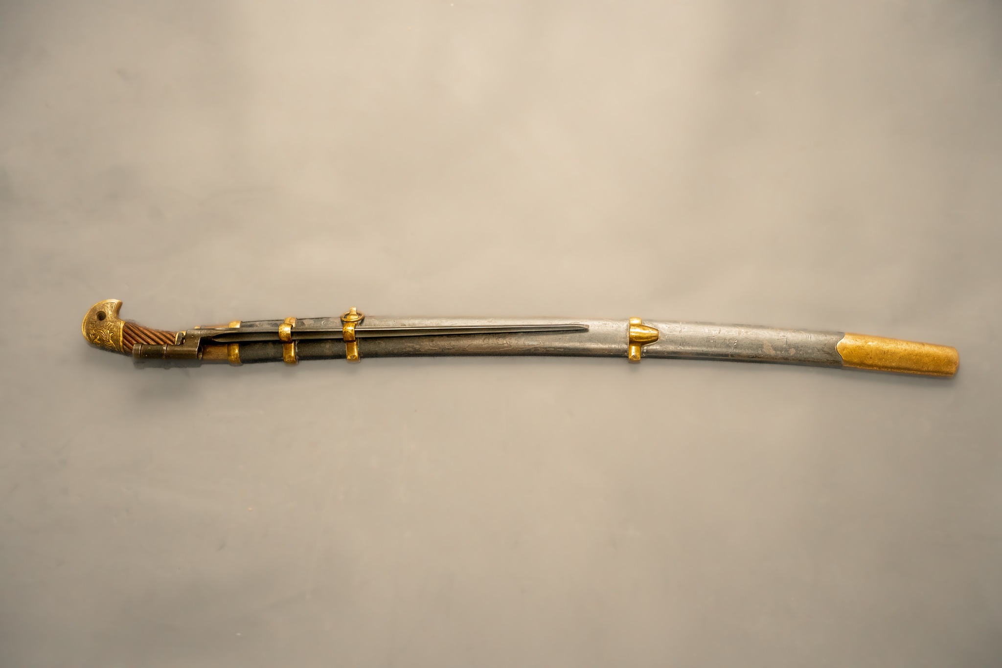(Adyghe language: (Сащхъуэ, Сашфэ, Сэшхуэ), Russian: (Шашка)) is a special kind of sabre; a very sharp, single-edged, single-handed, and guardless sword. In appearance, the shashka was midway between a full sabre and a straight sword. It had a slightly curved blade, and could be effective for both slashing and thrusting. The blade was either hollowed or fullered. There was no guard, but a large, curved pommel. The hilt was frequently highly decorated. It was carried in a wooden scabbard that enclosed part of the hilt. It was worn with the cutting edge to the rear, opposite to the sabre By the start of World War I, the weapon had become a distinctive symbol of the Russian army, just as it had found fame and glory among the Cossack border guards. After the 1917 Revolution the shashka became the primary edged weapon of the Red Army, and remained in use in Soviet cavalry units during the Second World War. Until 1949 the shashkawas the standard dress weapon of Soviet generals, and was issued to guard of honor soldiers from 1968.