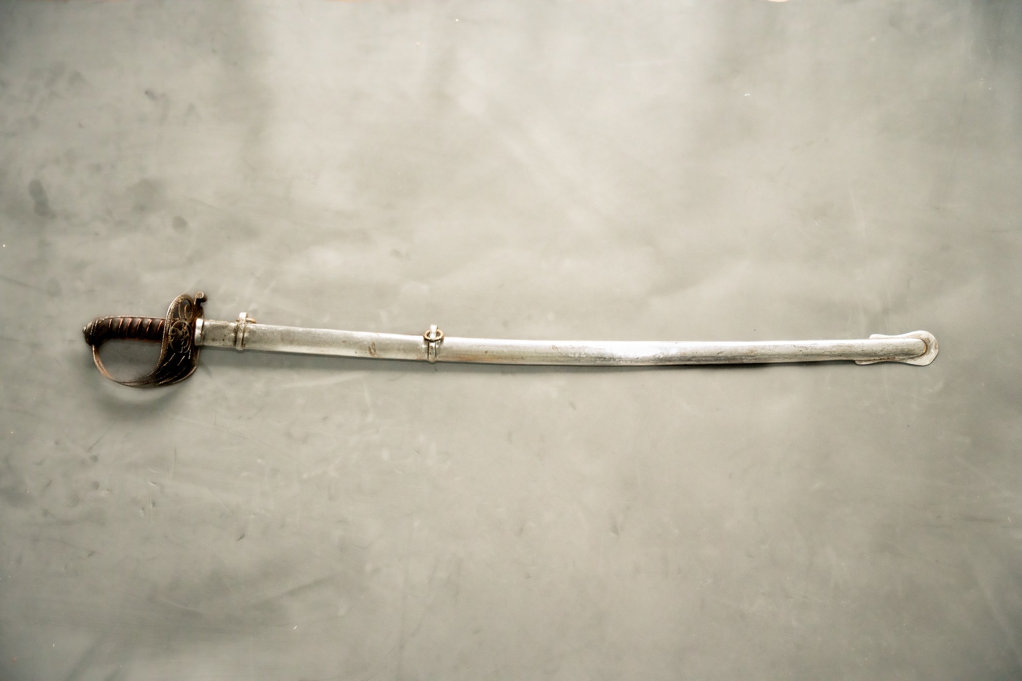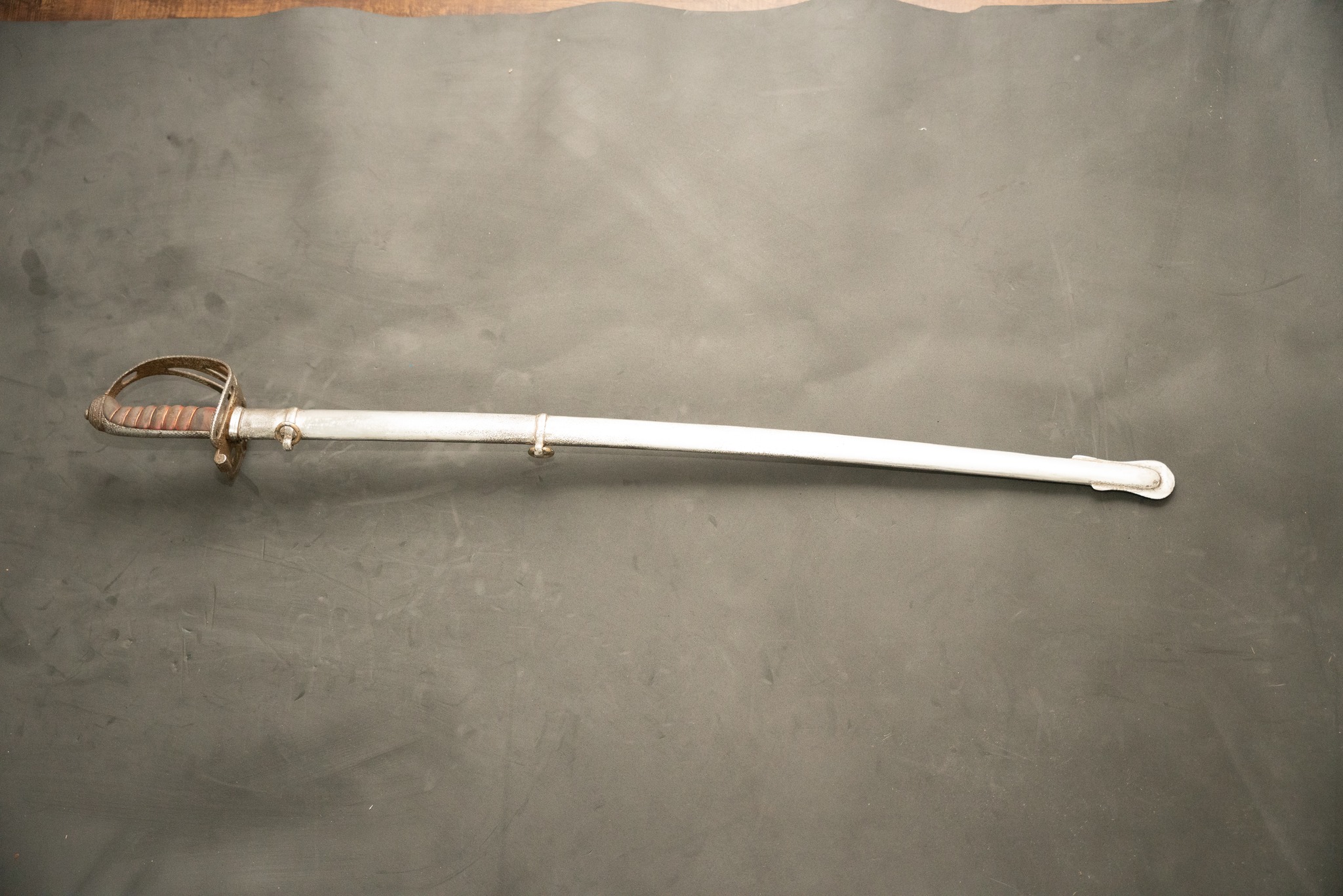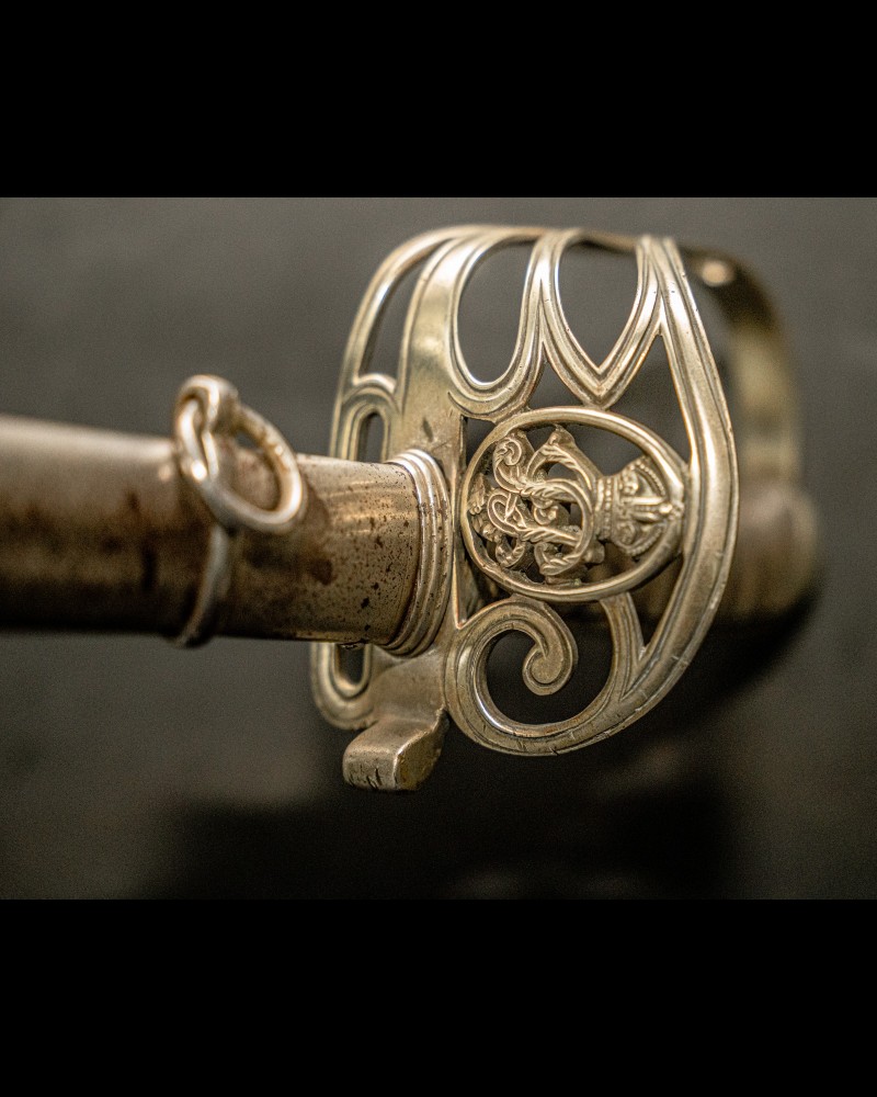 (1876-1901). As well as the coat of arms of the British Empire. On the other side: the British crown as well as the inscriptions '' ENSIGN FAWCETT, 49 TH NID '' around the design of a cavalry type horn. Manufacturer's marking '' ROBINSON MAKER BIRMINGHAM ''. The scabbard is in good condition with double rings.