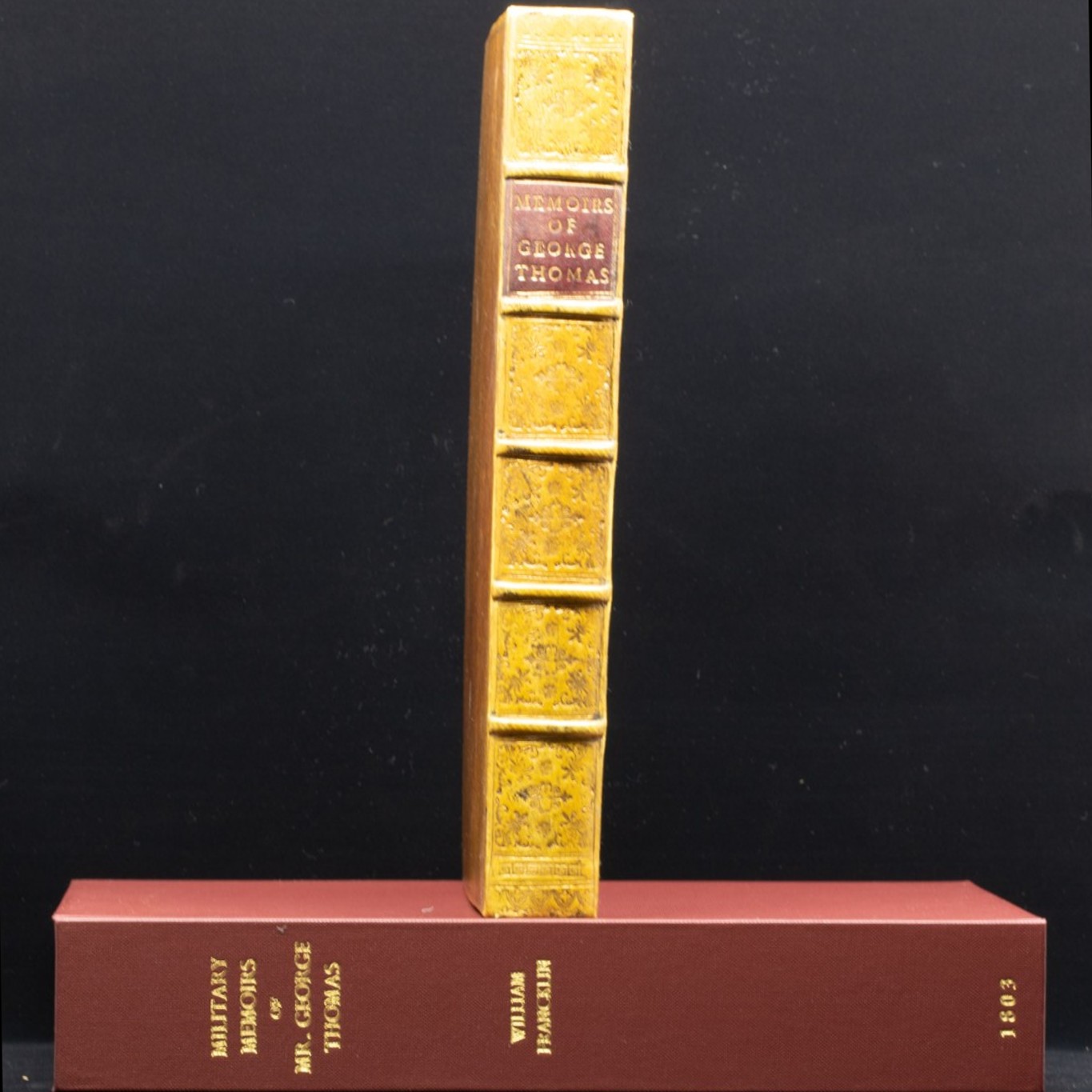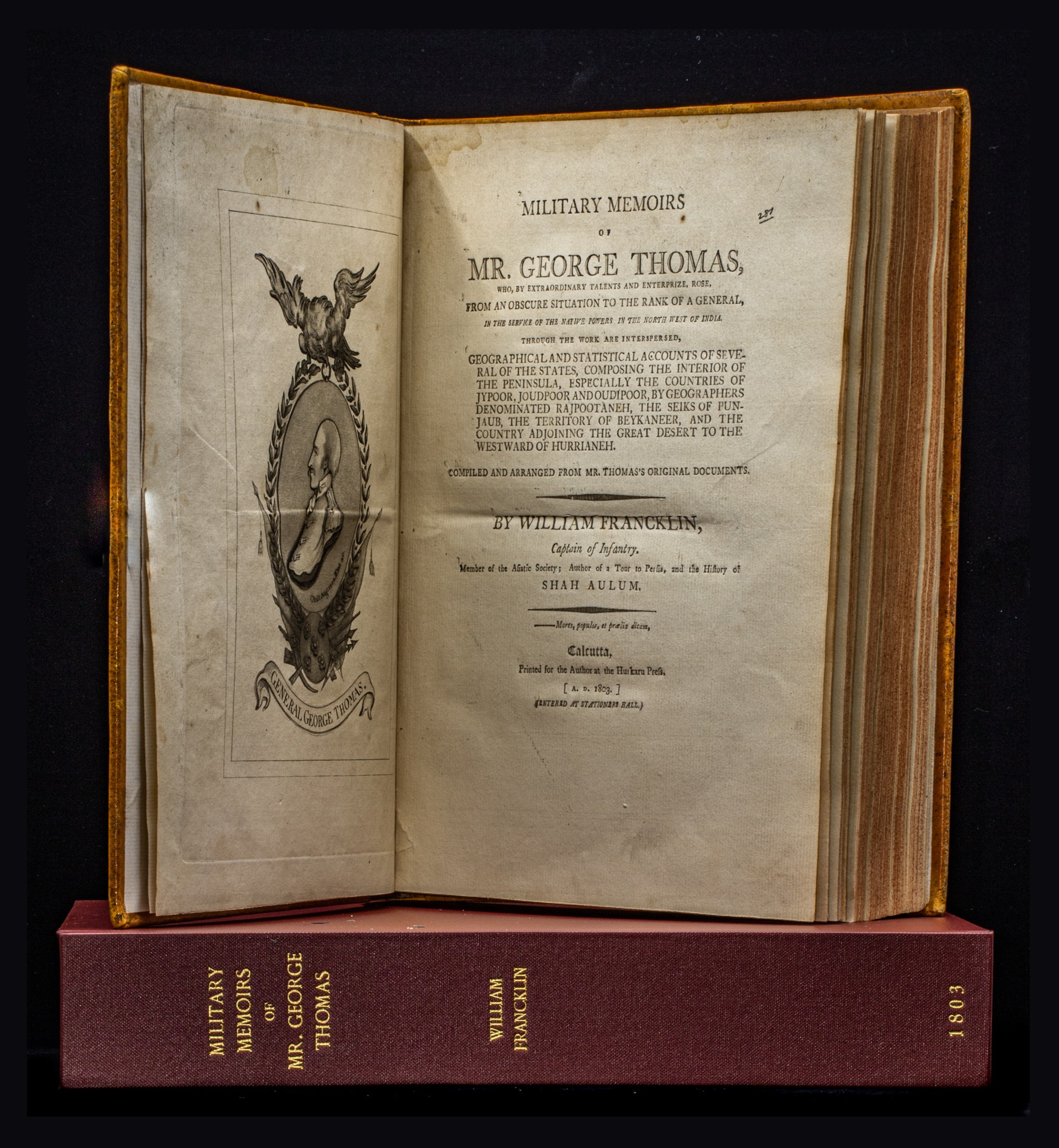 Born in Tipperary, Thomas arrived in Madras in 1781, possibly as a deserter from the Royal Navy. He began learning his trade as a freelance with "the Kanara Poligars, a group of armed chieftain-bandits. Thomas subsequently joined the nizam of Hyderabad's army as a private, and there learned his trade as a soldier. He gathered around him a personal bodyguard, nicknamed the Irish Pindaris, after the feared Indian mercenaries" (ODNB). He was employed by the Begum Sumru of Sirdhana, then by Appa Khande Rao, the Maratha governor of Meerut, leaving Rao in 1797 to join Bapu Sindhia, governor of Saharanpur. "In the fluid situation before the East India Company imposed its rule, and when large areas of land were left virtually ungoverned following the collapse of the Mughal empire, Thomas conceived the extraordinary idea of making himself 'King' of Lahore by conquering the Punjab. He marched his troops into Hariana in 1797 and easily captured the towns of hissar and hansi. He found the latter, an ancient fort, inhabited by one fakir and two lions. He stabilised an area of 120 miles by 5o miles in Hariana and repopulated Hansi... At the height of his fame that year Thomas described himself as *dictator in all the countries belonging to the Sikhs south of the Sutlej' and claimed to hold his land on behalf of the British government" (ibid.). Shortage of money forced Thomas to seek reemployment as a mercenary and he was ignominiously defeated by French-led combined Mahratta, Jat and Rajput force. He died of fever in 1802. Francklin had served with the Bengal army having been commissioned as an ensign in 1783. "By 1814 he had risen to the rank of lieutenant-colonel in both his regiment and the Bengal army. On being invalided on I October 1815 he was made regulating officer at Bhagalpur." He also "enjoyed a considerable reputation as an orientalist" and "was a member, and during the later years of his life, librarian and member of the council, of the Royal Asiatic Society" .