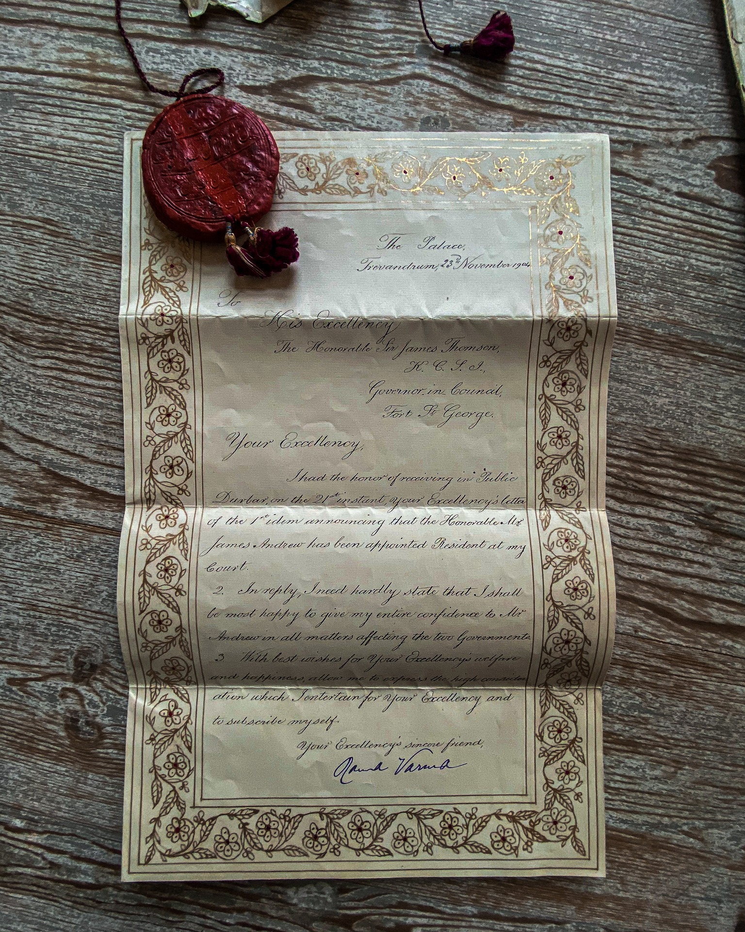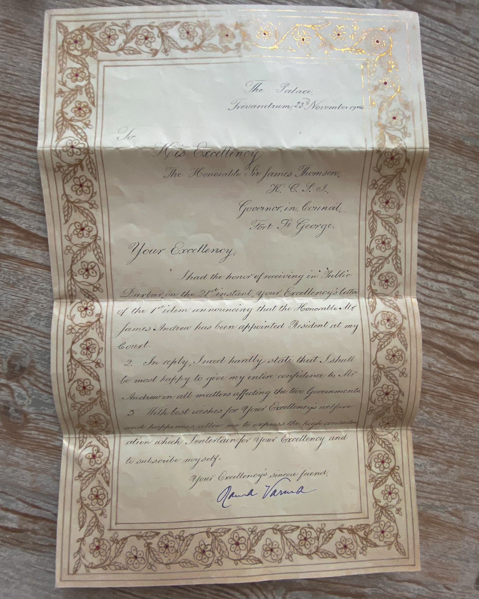 The appointment of a Resident to an important 19 gun salute state was a matter of great concern and the result of considerable deliberation. Such an example of a ruler’s most formal letter to a high ranking official is extremely scarce. H. H. Sir Sri Rama Varma V, G.C.S.I., Maharaja of Travancore ruled this 19 gun salute state from 1885 to 1924, He was made a Knight Grand Commander of the Most Exalted Order of the Star of India on the 1st January 1888. He was born in the year of the Indian Mutiny, 1857. Sir James Thomson, K.C.S.I. [1848-1927]. a member of the Governor’s Council at Fort St George [Madras], was Acting Governor of Madras between April and December 1905. He was a Scot, educated at the Grammar School and University of Aberdeen, going out to India in 1871 serving first at Godavari becoming Collector & Magistrate there in 1885. From 1889 he was Resident to the rulers of Travancore and Cochin before occupying senior posts in the revenue and salt departments of government. As a member of council he was appointed C.S.I. in 1902 and in 1902 advanced to the honour of Knight Commander of the Most Exalted Order of the Star of India James Andrew, an Irishman, arrived in 1879 in the Madras Civil Service. After service at N. Arcot, Ganjam, Trichinopoly, Tanjore, and Coimbatore he was appointed Resident to Travancore and Cochin in 1904, later becoming a member of the Governor General’s legal council.