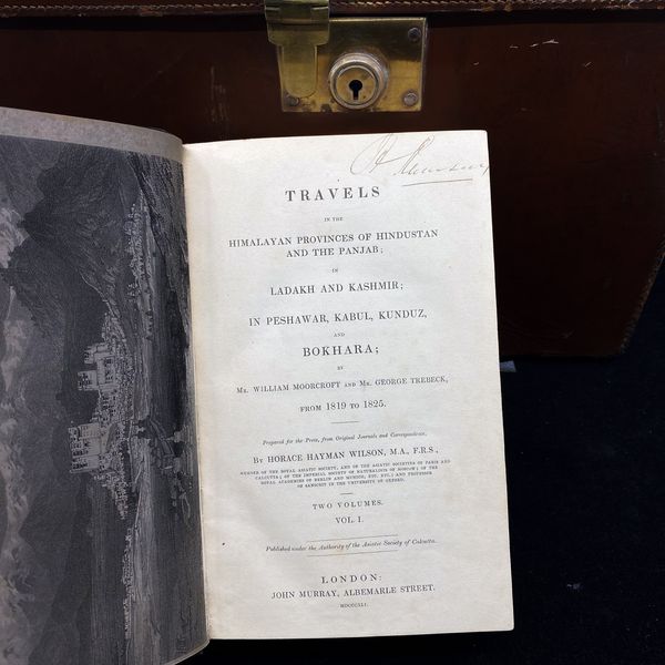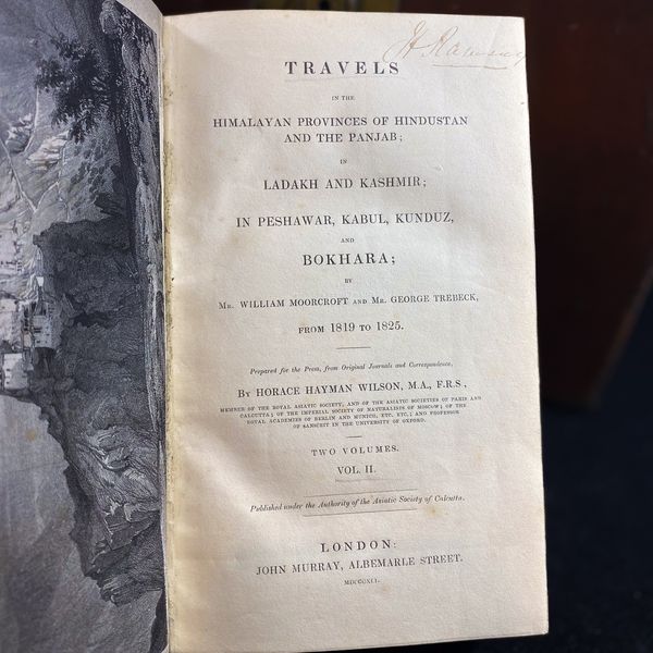 Travels in the Himalayan provinces of Hindustan and the Panjab; in Ladakh and kashmir; in Peshawar, Kabul, Kunduz, and Bokhara (2 volumes) Moorcroft, William, 1767-1825. Trebeck, George, joint author. Wilson, H. H. (Horace Hayman), 1786-1860, ed. Asiatic Society of Bengal. Created / Published London, J. Murray, 1841. Travels in the Himalayan provinces of Hindustan and the Panjab; in Ladakh and Kashmir; in Peshawar, Kabul, Kunduz, and Bokhara," by Moorcroft, Trebeck, and Wilson, offers a captivating account of Central Asia's wonders. Published in 1841, the travelogue delves into the beauty of Hindustan, Panjab, Ladakh, and Kashmir, and explores the bustling cities of Peshawar, Kabul, Kunduz, and Bokhara. Supported by the Asiatic Society of Bengal and part of the Joseph Meredith Toner Collection, this historical narrative uncovers the cultural tapestry and enchanting landscapes of Central Asia. Vol.1 https://archive.org/details/dli.csl.5042/page/n1/mode/2up Vol.2 https://archive.org/details/dli.csl.5172/page/n1/mode/2up