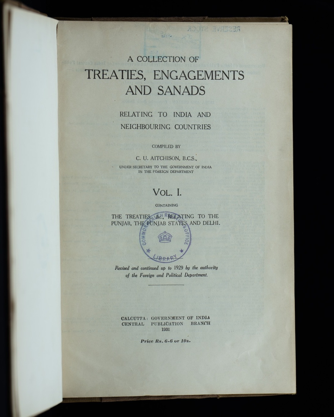 Published 1931 A collection of treaties, engagements and sanads relating to India and neighbouring countries Compiled by C.U. Aitchison, B.C.S., under secretary to the government of India in the Foreign department (THE TREATIES RELATING TO THE PUNJAB ,THE PUNJAB STATE AND DELHI)