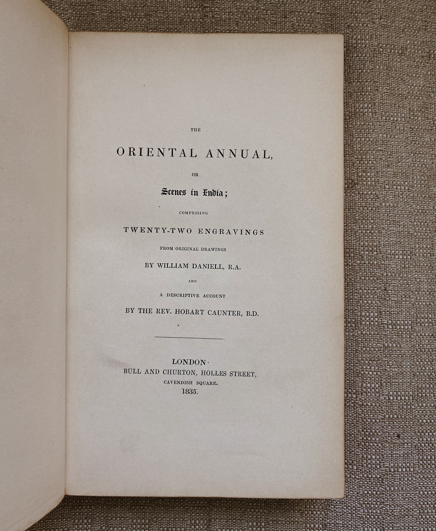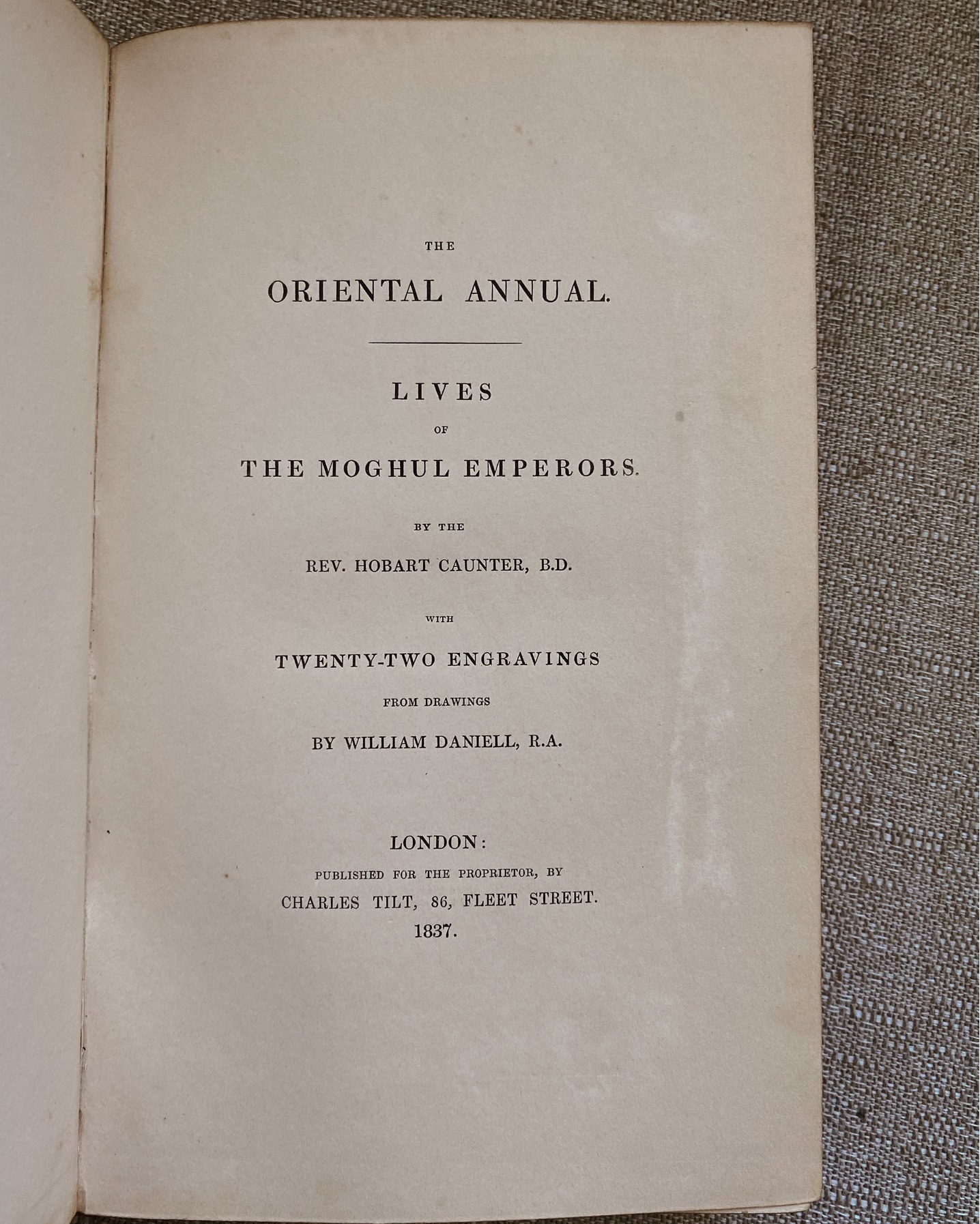 Oriental annual | Lives of the Moghul Emperors CAUNTER, John Hobart 1837 INDIA 1ed Oriental Annual Mogul Mughal Empire Illustrated Timur & Babur Hobart Caunter s Oriental Annual was a recurring 19th-century series containing stories from life and history in India. Caunter, and English writer, spent years of his life in India where he began writing and publishing numerous books on Indian culture, life, and history. This 1837 issue of Oriental Annual included biographies of famous Mogul conquerors and emperors such as Timur and Babur as well as descriptions of prisons in Delhi, the Ganges River, Capta Castle in Bhutan, and much more! CAUNTER, John Hobart Oriental annual | Lives of the Moghul Emperors London: C. Tilt, 1837. 1835 INDIA 1ed Oriental Annual Tiger & Rhino Hunting Hindu Temples Rohilkhand Hobart Caunter’s “Oriental Annual” was a recurring 19th-century series containing stories from life and history in India. Caunter, and English writer, spent years of his life in India where he began writing and publishing numerous books on Indian culture, life, and history. This 1835 issue of ‘Oriental Annual’ includes descriptions of big game hunting (tigers, rhinos, Tibetan yaks, etc.), Hindu temples and mosques, Himalayan mountains and mountain-dwelling tribes, Rohilkhand voyages, and much more. https://archive.org/details/orientalannualor41837dani/page/n7/mode/2up