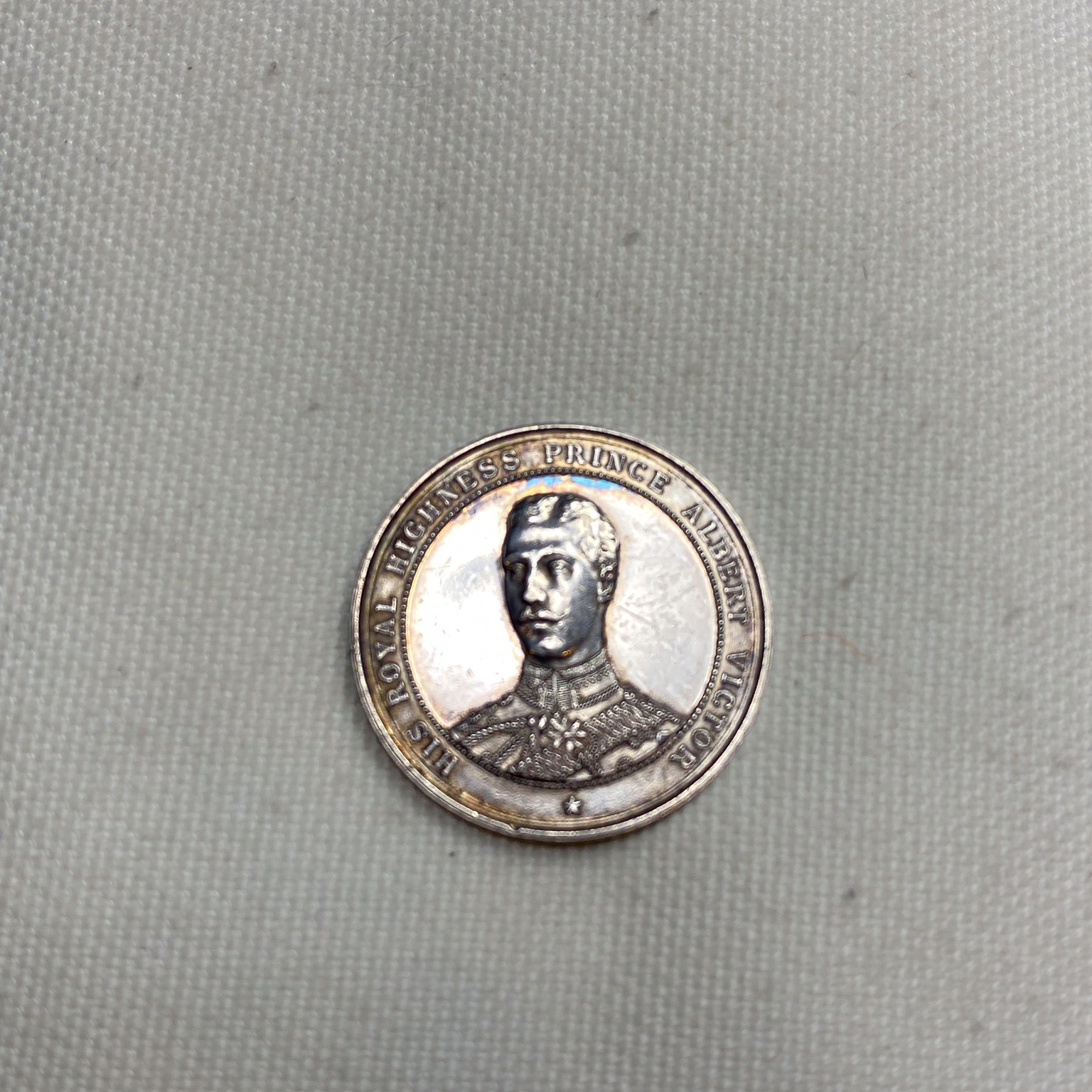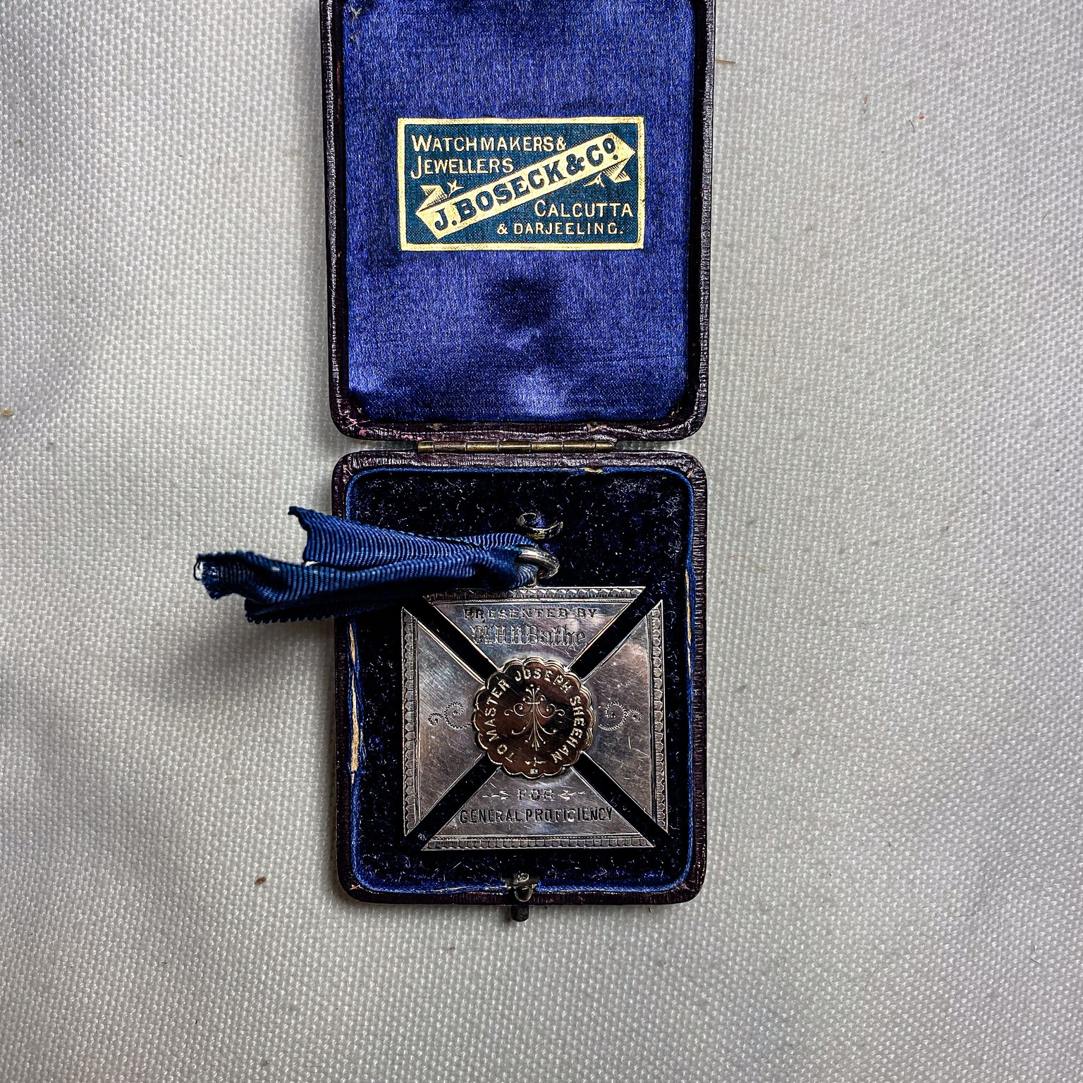Silver Golfing Prize Medal: Silver medal awarded as a golfing prize. The reverse is engraved with the inscription "Cleek Compt. 1953, Winner Taj-ud-Din." Presentation Silver Cross with Gold Centre, Calcutta and Darjeeling: A silver cross with a gold center, presented as a token of appreciation. Made by J. Boseck and Co., Calcutta, and engraved with the inscription "Presented by Dr. H.H. Bathe to Master Joseph Sheenan for General Proficiency." Comes with a case of issue made by Boseck and Co. ਵੇਲਜ਼ ਦੇ ਪ੍ਰਿੰਸ ਐਲਬਰਟ ਵਿਕਟਰ ਦੀ ਭਾਰਤ ਫੇਰੀ, 1889-90, ਚਾਂਦੀ ਦਾ ਤਗਮਾ: ਵਰਣਨ: 1889-90 ਵਿੱਚ ਵੇਲਜ਼ ਦੇ ਪ੍ਰਿੰਸ ਐਲਬਰਟ ਵਿਕਟਰ ਦੀ ਭਾਰਤ ਫੇਰੀ ਦੀ ਯਾਦ ਵਿੱਚ ਸਿਲਵਰ ਮੈਡਲ। ਹਸਤਾਖਰਿਤ, ਸੰਭਵ ਤੌਰ 'ਤੇ ਡਬਲਯੂ. ਮੇਅਰ ਦੁਆਰਾ ਡਿਜ਼ਾਈਨ ਕੀਤਾ ਗਿਆ ਹੈ। ਜੇਸੀ ਬੇਚਟਲਰ ਐਂਡ ਕੰਪਨੀ, ਇਲਾਹਾਬਾਦ ਦੁਆਰਾ ਵੇਚਿਆ ਬਸਤੀਵਾਦੀ ਅਤੇ ਭਾਰਤੀ ਪ੍ਰਦਰਸ਼ਨੀ, ਲੰਡਨ, 1886, ਕਾਂਸੀ ਦਾ ਤਗਮਾ: ਵਰਣਨ: 1886 ਵਿੱਚ ਲੰਡਨ ਵਿੱਚ ਆਯੋਜਿਤ ਬਸਤੀਵਾਦੀ ਅਤੇ ਬਰਤਾਨਵੀ ਭਾਰਤ ਪ੍ਰਦਰਸ਼ਨੀ ਦੀ ਯਾਦ ਵਿੱਚ ਕਾਂਸੀ ਦਾ ਤਗਮਾ। ਏ.ਐਸ.ਸੀ.ਬੀ. ਇੰਡੀਆ ਈਸਟਰਨ ਕਮਾਂਡ, ਸਿਲਵਰ ਮੈਡਲ, ਲਗਭਗ 1900: A.S.C.B ਨਾਲ ਸਬੰਧਿਤ ਚਾਂਦੀ ਦਾ ਤਗਮਾ ਇੰਡੀਆ ਈਸਟਰਨ ਕਮਾਂਡ, 1900 ਦੇ ਆਸਪਾਸ ਡੇਟਿੰਗ। G.C.S.I. ਸਿਲਵਰ ਗੋਲਫਿੰਗ ਇਨਾਮੀ ਮੈਡਲ: ਕਲੀਕ ਕੰਪਟ. 1953, ਵਿਜੇਤਾ ਤਾਜ-ਉਦ-ਦੀਨ" ਨਾਲ ਉੱਕਰੀ ਹੋਈ ਹੈ। ਗੋਲਡ ਸੈਂਟਰ, ਕਲਕੱਤਾ ਅਤੇ ਦਾਰਜੀਲਿੰਗ ਦੇ ਨਾਲ ਪੇਸ਼ਕਾਰੀ ਸਿਲਵਰ ਕਰਾਸ: ਜੇ. ਬੋਸੇਕ ਐਂਡ ਕੰਪਨੀ, ਕਲਕੱਤਾ ਦੁਆਰਾ ਬਣਾਇਆ ਗਿਆ, ਅਤੇ ਸ਼ਿਲਾਲੇਖ ਨਾਲ ਉੱਕਰੀ ਹੋਈ ਹੈ "ਡਾ. ਐਚ. ਐਚ. ਬਾਥ ਦੁਆਰਾ ਮਾਸਟਰ ਜੋਸਫ਼ ਸ਼ੀਨਾਨ ਨੂੰ ਜਨਰਲ ਪ੍ਰੋਫੀਸ਼ੈਂਸੀ ਲਈ ਪੇਸ਼ ਕੀਤਾ ਗਿਆ
